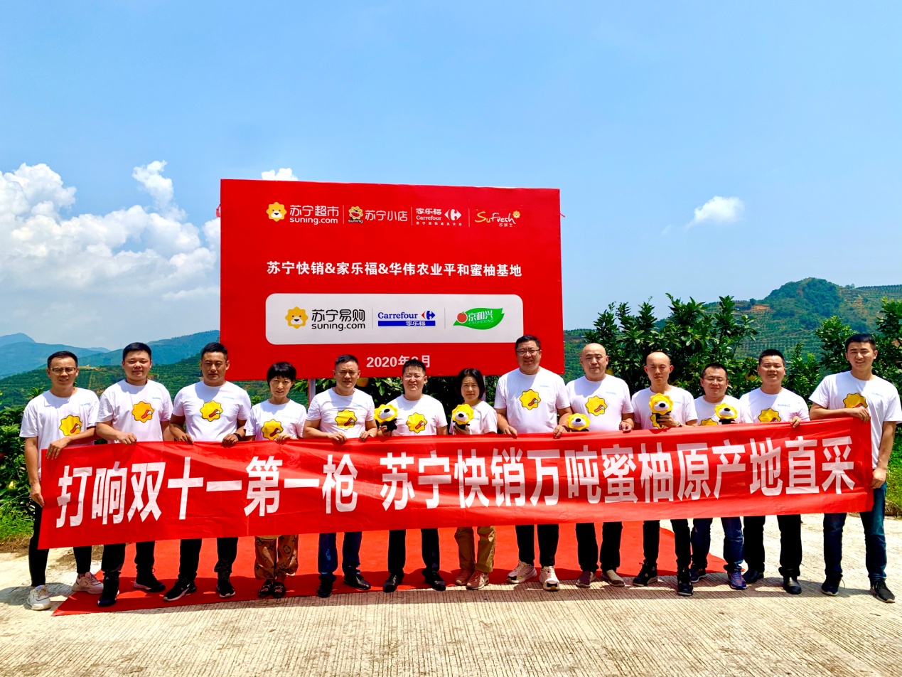 8月26日,蘇寧家樂福中國區(qū)生鮮采購總監(jiān)孫樂超、水果組總監(jiān)孟碩、華南區(qū)采購總監(jiān)周益明,以及蘇寧易購水果組采銷總監(jiān)戴躍等一行來到位于福建省平和縣的華偉農(nóng)業(yè)蜜柚基地,與平和縣委書記郭德志等地方領(lǐng)導(dǎo)共同宣布蘇寧家樂福&華偉農(nóng)業(yè)蜜柚直采基地的正式啟動。