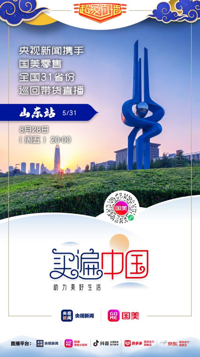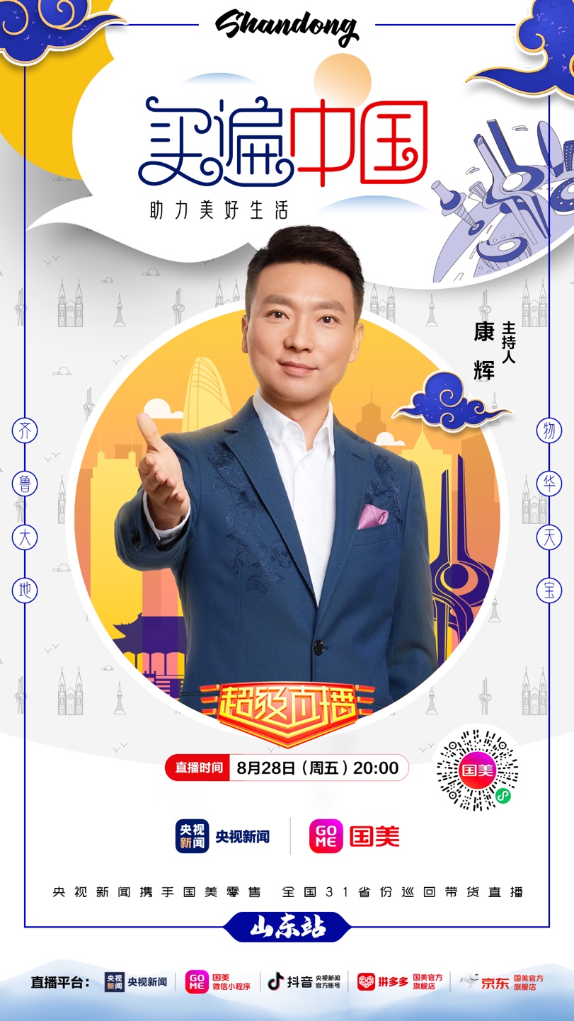 8月28日晚20點(diǎn),記得鎖定國(guó)美微信小程序、拼多多國(guó)美官方旗艦店、京東國(guó)美官方旗艦店,及央視新聞的客戶端、抖音號(hào),“買遍中國(guó)”山東站直播間,一起來(lái)看“央視大 boy”康輝帶貨狂奔!(常軍平)