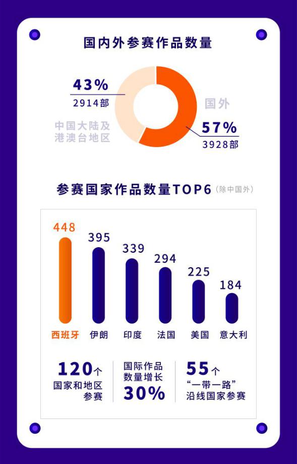 自今年9月中旬全球短片征集啟動以來,本屆短片節(jié)獲得來自世界各地創(chuàng)作者的積極響應(yīng),盡管受到新冠疫情影響以及遭遇影視產(chǎn)業(yè)寒冬,但本屆短片節(jié)參賽作品數(shù)量卻逆勢而上,并刷新歷史新高。而且,在今年的6842部參賽作品中,國際參賽作品多達(dá)3928部,數(shù)量較去年增長30%,占作品總量的57%。在今年參賽的120個(gè)國家和地區(qū)中,作品數(shù)量位居前六名的國家分別是西班牙(448部)、伊朗(395部)、印度(339部)、法國(294部)、美國(225部)和意大利(184部)。值得一提的是,作為深圳市參與“一帶一路”建設(shè)重點(diǎn)項(xiàng)目,短片節(jié)今年吸引了來自“一帶一路”沿線的55個(gè)國家參賽,約占目前65個(gè)“一帶一路”沿線國家數(shù)的85%,短片節(jié)作為推動“一帶一路”沿線國家間人文交流、促進(jìn)全球跨文化傳播的重要平臺的作用日益凸顯,國際化進(jìn)一步走向深入。