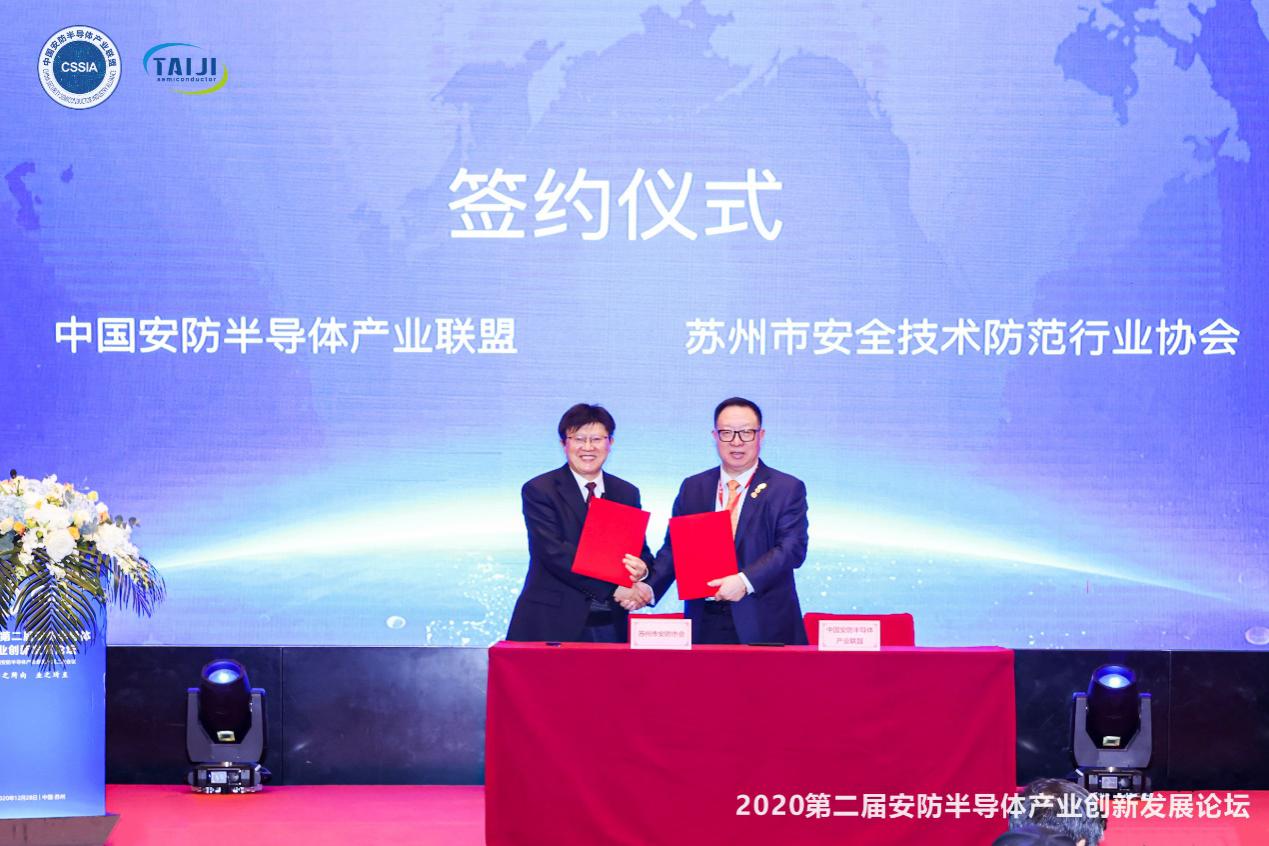 中國安防半導(dǎo)體產(chǎn)業(yè)聯(lián)盟主席楊金才和蘇州市安全技術(shù)防范行業(yè)協(xié)會(huì)秘書長王坤泉現(xiàn)場(chǎng)進(jìn)行簽約