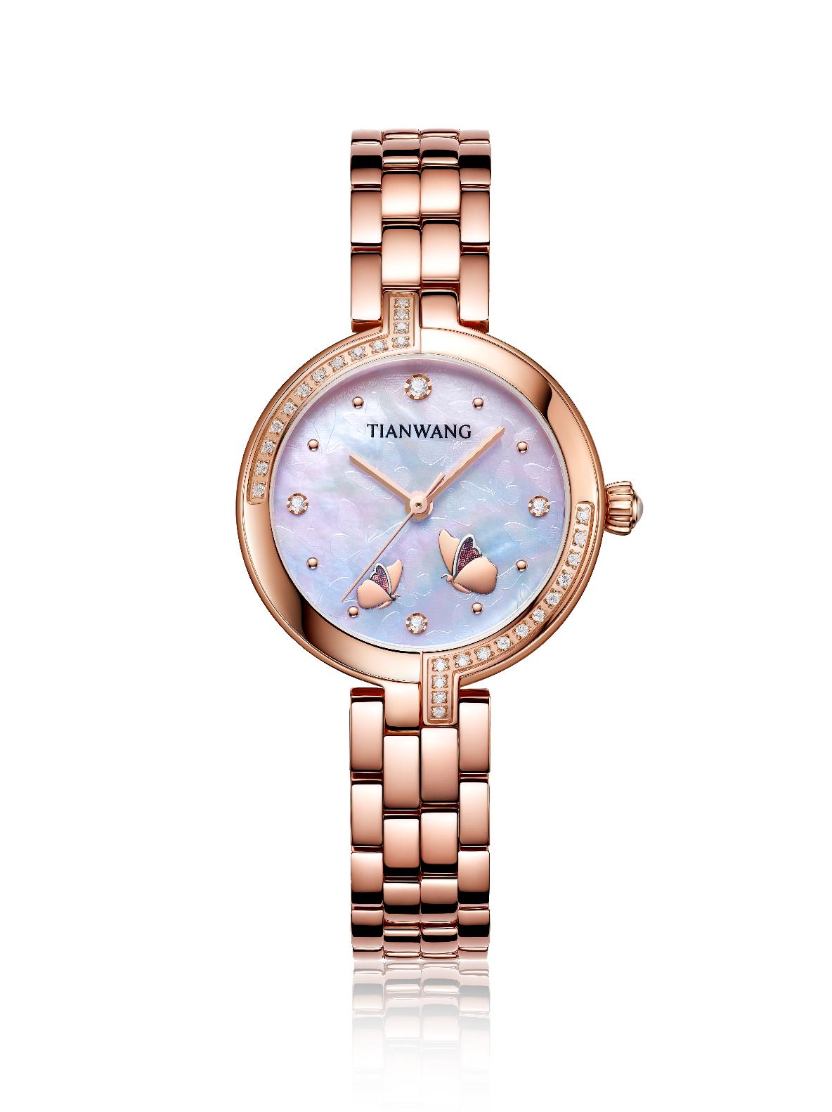 這次合作的腕表,沿襲了天王表的精品品質(zhì)和設(shè)計美學(xué),有點“小確幸”的風(fēng)格,整體很秀氣但是細節(jié)都誠意滿滿。表是蝴蝶的天空,指針是蝴蝶的舞步。表盤采用蝴蝶壓印貝母,在藍寶石玻璃表鏡下,兩只立體蝴蝶翩然起舞,人如蝴蝶,蝴蝶像人,都迷戀這花花世界,想要縱情暢游其中。腕表刻度和表圈由璀璨皓石點綴,3點、6點、9點、12點使用較大皓石,使得整個表盤錯落有致,富有層次感。搭配夢幻南瓜把的,極具浪漫色彩。玫瑰金色不銹鋼表殼,給人以優(yōu)雅炫目之感,質(zhì)感鋼帶,光澤度明亮,搭配不銹鋼蝴蝶扣,錦上添花,佩戴效果自然舒適。