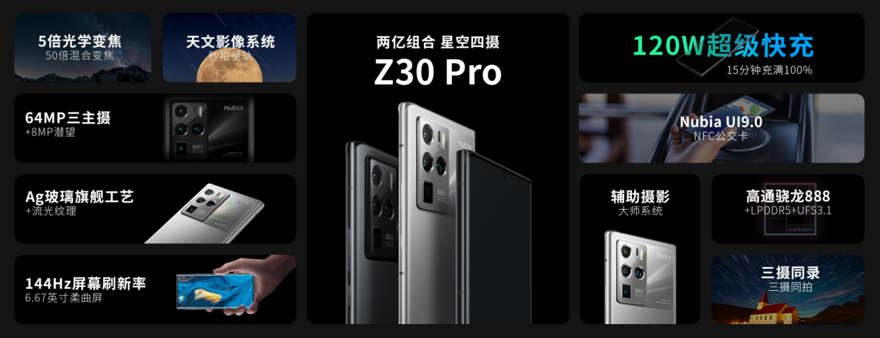 努比亞Z30 Pro將用戶需求與行業(yè)最前沿科技充分結(jié)合,打造無短板頂尖配置:搭載高通驍龍888+LPDDR5+UFS3.1頂尖性能鐵三角及行業(yè)最高的2億像素四攝組合全主攝影像系統(tǒng),獨(dú)占影像旗艦中最強(qiáng)的120W超級快充與144 Hz超高刷新率,并將全新升級的UI交互系統(tǒng)和更加強(qiáng)悍易用的影像功能融于一身,貫徹科技、藝術(shù)與用戶需求完美融合的平衡之道。全新一代努比亞Z系列旗艦——Z30 Pro攜星光而來。