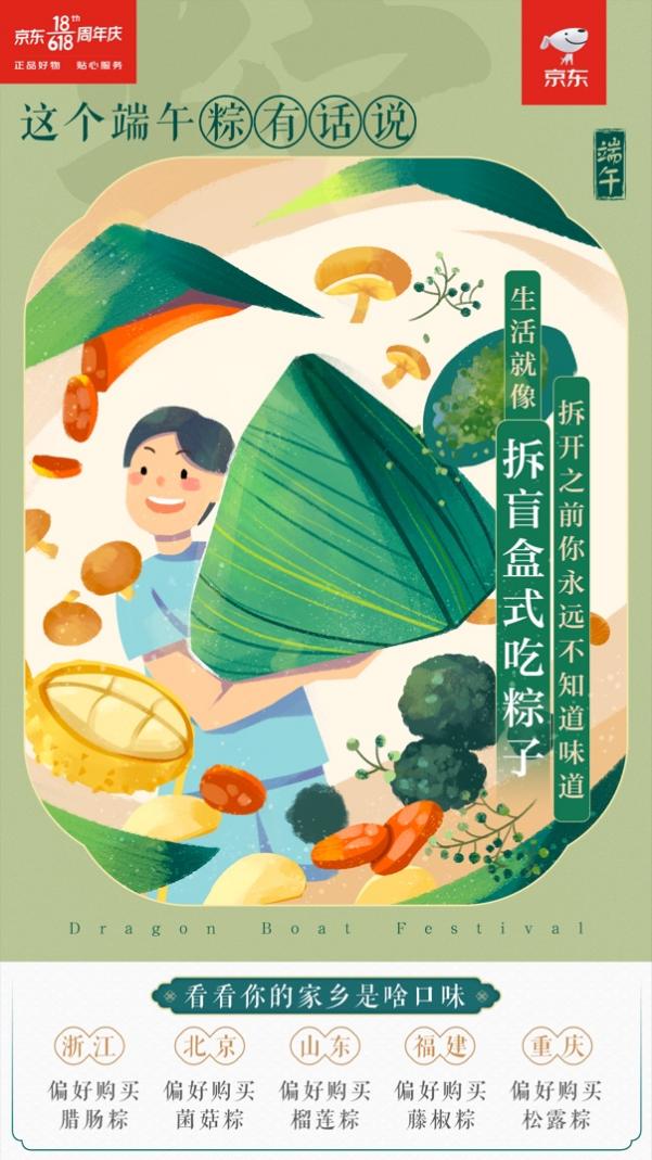 此外,京東自有品牌京東京造原創(chuàng)設計產(chǎn)出的一款國潮包裝的粽子禮盒,在這個端午節(jié)也受到了消費者的極大歡迎。產(chǎn)品包裝上,傳統(tǒng)龍舟競逐插畫所演繹出的國潮美學,正呼應了傳統(tǒng)風尚的迅速崛起,而別出心裁的原創(chuàng)禮盒設計,則實現(xiàn)了精準創(chuàng)新,滿足了更年輕的消費者個性。