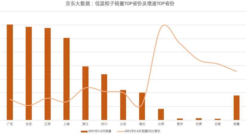 與低溫發(fā)展趨同的,還有平臺助力食品企業(yè)數(shù)字化和渠道完善帶來的整個行業(yè)對下沉市場的發(fā)掘——從銷量看北京、廣東及江浙滬等發(fā)達地區(qū)是低溫粽子的主要消費區(qū)域,四川、山東、湖北等省緊隨其后。而隨著京東冷鏈和物流的下沉和完善,山西、貴州、甘肅、云南、安徽等省區(qū)的增速位列全國前五。