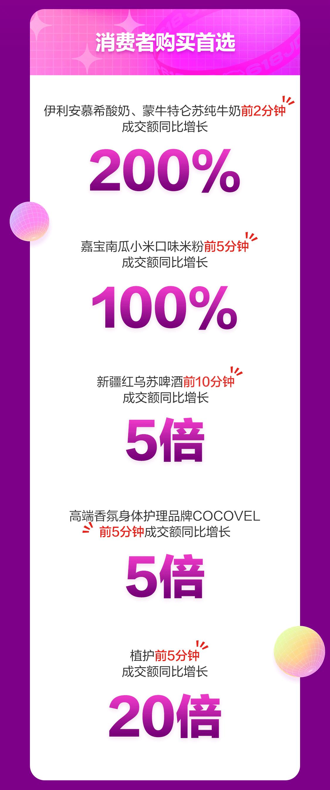 6月18日開場(chǎng)前5分鐘,食品知名品牌增勢(shì)明顯。蒙牛前5分鐘成交額同比增長(zhǎng)超200%,福臨門前10分鐘成交額同比增長(zhǎng)112%,伊利前5分鐘成交額同比增長(zhǎng)超200%,其中伊利安慕希酸奶、蒙牛特侖蘇純牛奶兩款爆品前2分鐘成交額同比增長(zhǎng)200%。