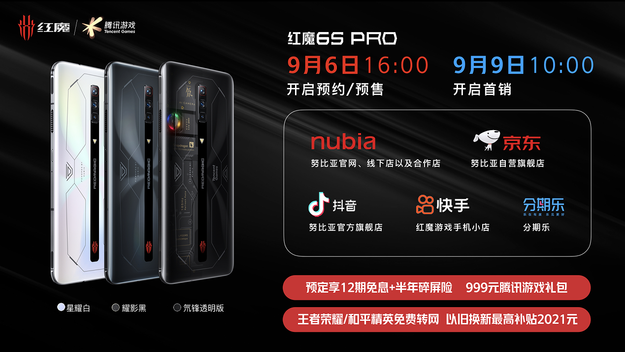 紅魔6S Pro目前已在努比亞官網(wǎng),努比亞京東自營旗艦店開啟預(yù)售,9月9日上午10點全國線上線下渠道同步開售!現(xiàn)在預(yù)定享12期免息并贈送半年碎屏險,購機尊享價值999元的騰訊游戲禮包、王者榮耀/和平精英免費轉(zhuǎn)網(wǎng)資格,以舊換新最高補貼2021元。