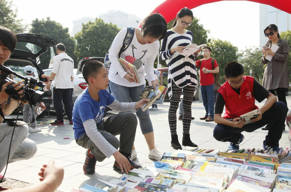 深圳市實(shí)驗(yàn)中學(xué)的車尾箱展位前圍滿了前來換書的人