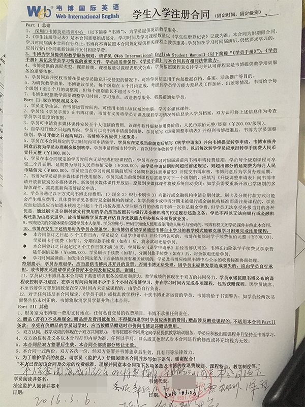 6節(jié)課,花費(fèi)34800元 投訴深圳市韋博國(guó)際英語培訓(xùn)中心單方合同條款,忽視消費(fèi)者權(quán)益。