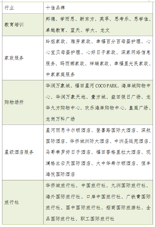 教育培訓(xùn)方面20個課外培訓(xùn)機構(gòu)品牌的凈推薦值得分均為正值,整體平均得分為13.7,邦德教育以19.9的高分榮登教育培訓(xùn)行業(yè)榜單首位;家政服務(wù)行業(yè)20家調(diào)查企業(yè)平均分值為12.8,玲姐家政以高于平均值7.4分,排名家政行業(yè)第一位;購物場所方面選取20家購物中心,20家購物中心得分同樣為正值,整體平均分為19.8,華潤萬象城以28.5的高分獲得購物中心排行榜桂冠,福田星河coco park以0.1分的劣勢排在榜單第二位;星級酒店服務(wù)方面,平均凈推薦值達到30.8分,高于同期發(fā)布其他四個行業(yè),排名第一的是星河麗思卡爾頓酒店,凈推薦值為37.0分;旅行社方面,排名第一的旅行社為華僑城旅行社評分29.8分,但20家旅行社之間評分差異較大,凈推薦值僅為12.0分,低于同期發(fā)布的其他行業(yè)。