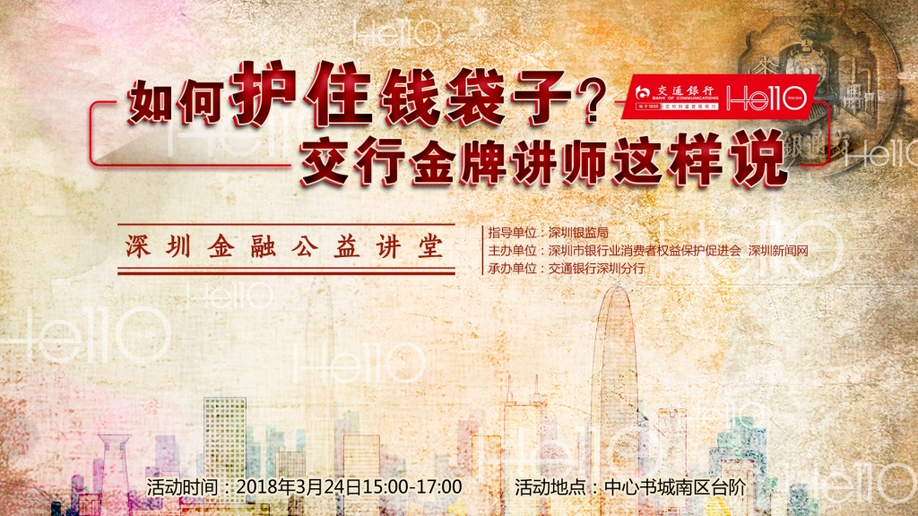 在深圳銀監(jiān)局指導(dǎo)下,由深圳新聞網(wǎng)和深圳市銀行業(yè)消費(fèi)者權(quán)益保護(hù)促進(jìn)會(huì)共同主辦,交通銀行深圳分行承辦的2018年“深圳金融公益講座”系列活動(dòng)將在3月24日14:30,于中心書(shū)城南區(qū)大臺(tái)階拉開(kāi)帷幕。