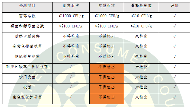 歐盟對化妝品中微生物要求更加嚴(yán)格,國標(biāo)要求5項(xiàng),歐標(biāo)要求9項(xiàng)。檢測結(jié)果顯示:8款氣墊粉底微生物檢測結(jié)果不僅符合國家標(biāo)準(zhǔn)要求,而且符合歐盟法規(guī)要求。