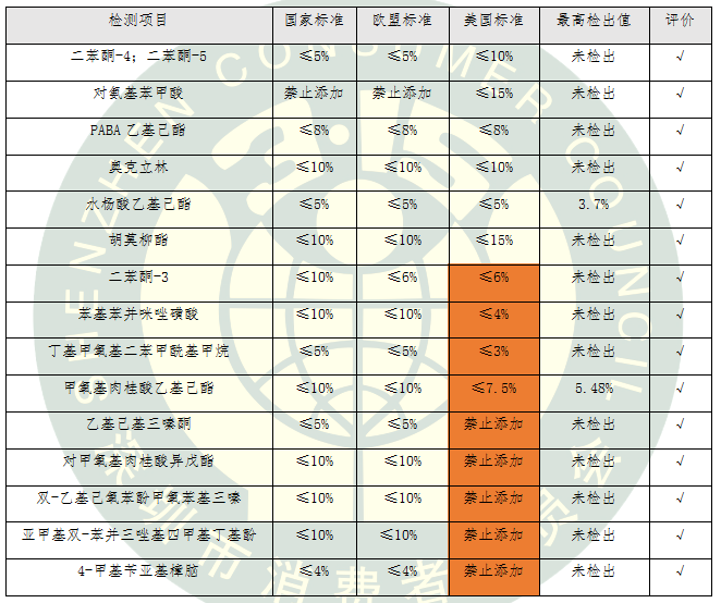 防曬化妝品在美國按非處方藥(OTC)管理,新的防曬劑當(dāng)作新藥品來批準(zhǔn),審評要求非常嚴(yán)格。本次比較試驗(yàn)測試的15類化學(xué)防曬劑按照國標(biāo)、歐標(biāo)和美標(biāo)中最嚴(yán)格的標(biāo)準(zhǔn)進(jìn)行評價。我國允許使用的5類化學(xué)防曬劑在美國被禁止使用,還有4類化學(xué)防曬劑在美國的限量要求更加嚴(yán)格。