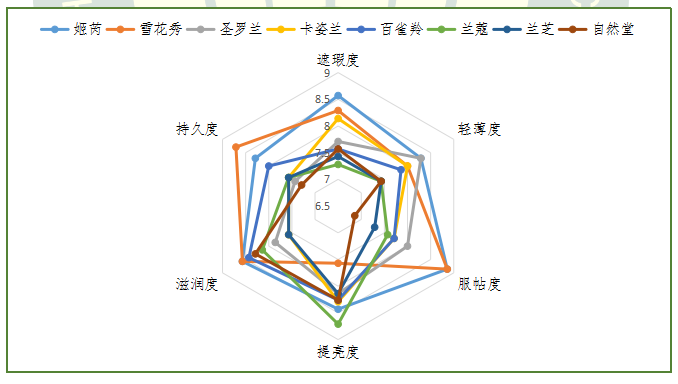 獲得本次感官評價指標(biāo)綜合得分前三名的品牌為:姬芮、雪花秀和圣羅蘭,得分分別為:8.44、8.22和7.91。8款產(chǎn)品在感官評價中均達(dá)到優(yōu)良水平以上。