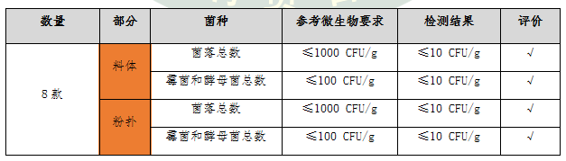 檢測結(jié)果顯示:8款氣墊粉底的粉撲和料體的菌落總數(shù)、霉菌和酵母菌總數(shù)檢出量均低于10 CFU/g,遠(yuǎn)低于產(chǎn)品微生物的標(biāo)準(zhǔn)要求限值,屬于安全范圍,消費(fèi)者無需過度擔(dān)心。