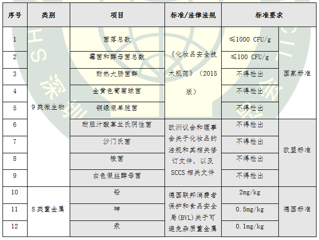 a.微生物(9種):菌落總數(shù)、霉菌和酵母菌總數(shù)、耐熱大腸菌群、金黃色葡萄球菌、銅綠假單胞菌、耐膽汁酸革蘭氏陰性菌、沙門氏菌、梭菌和白色假絲酵母菌