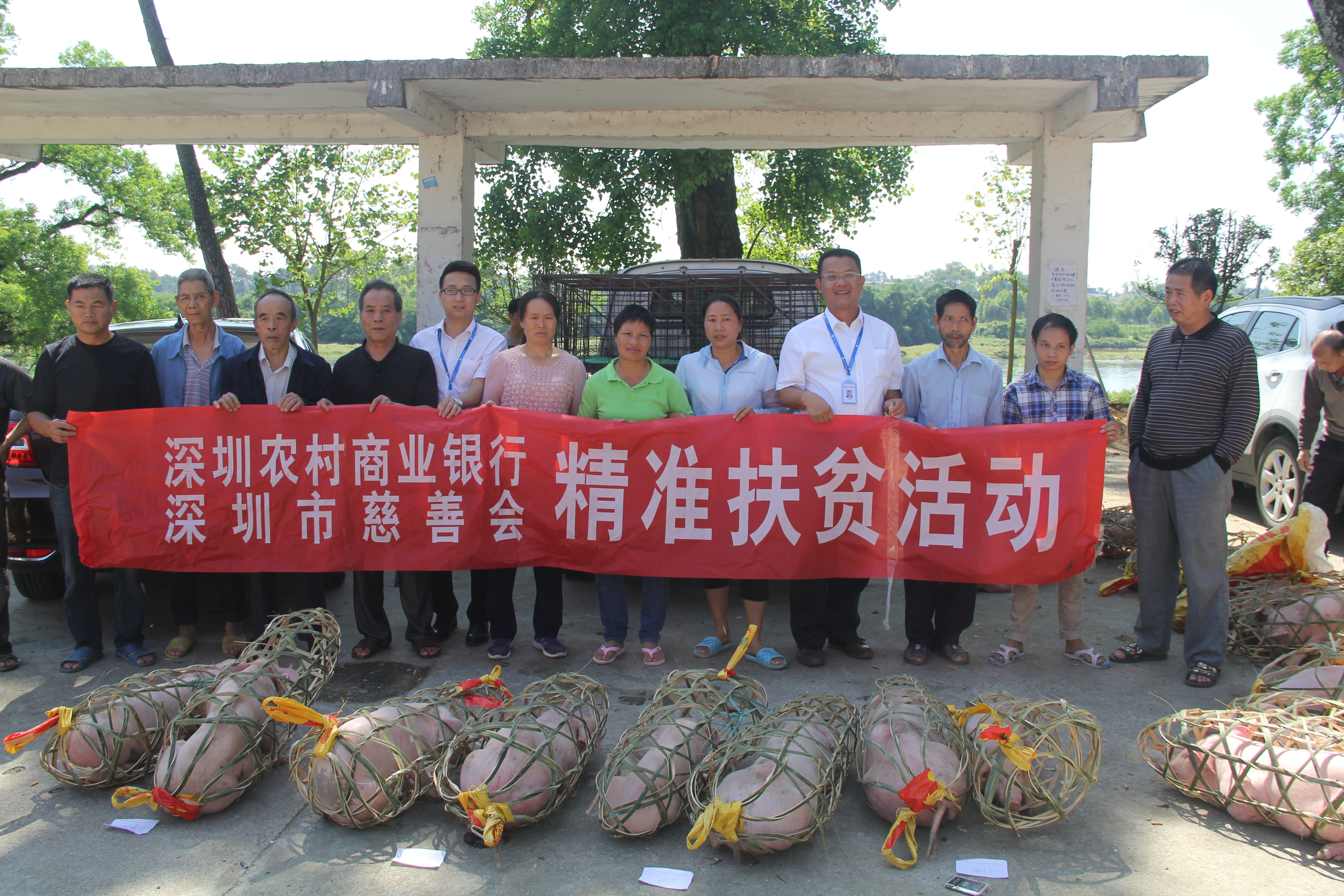 2017年,深圳農(nóng)商行的廣西6家機(jī)構(gòu)開(kāi)展了“深桂心連心”精準(zhǔn)扶貧活動(dòng),向所在地貧困戶免費(fèi)發(fā)放農(nóng)業(yè)生產(chǎn)資料,通過(guò)采購(gòu)等值的農(nóng)資(如雞、鴨、豬崽、農(nóng)作物種子與樹(shù)苗等)按戶發(fā)放給扶貧對(duì)象,待雞、鴨、豬崽和農(nóng)作物可出售時(shí)由廣西各機(jī)構(gòu)介紹銷售或負(fù)責(zé)回購(gòu),確保扶貧對(duì)象既能脫貧,又能提高致富能力。深桂心連心精準(zhǔn)扶貧活動(dòng),共資助了299戶貧困戶,扶貧總投入為292879元。通過(guò)扶貧活動(dòng),帶動(dòng)更多的貧困戶依靠辛勤勞動(dòng),脫貧致富。