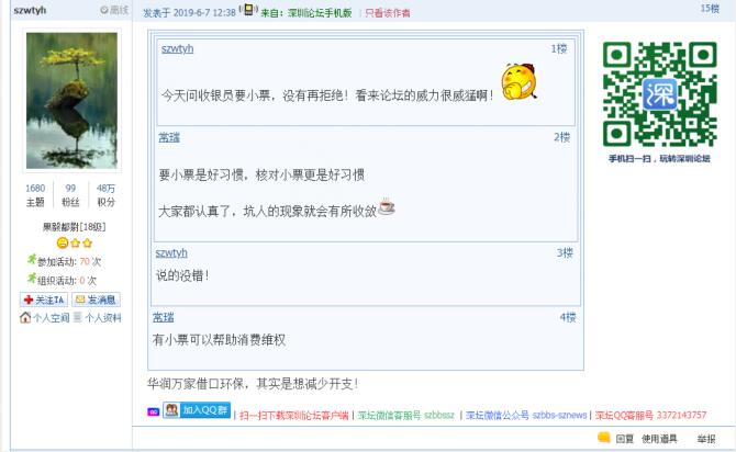 記者從問政平臺(tái)得知,5月底以來,還有市民發(fā)帖反映,除華潤萬家外,科技園萬象天地華潤Ole、僑香路沃爾瑪?shù)瘸幸泊嬖诓惶峁┘堎|(zhì)購物小票的情況。目前,市民仍然普遍認(rèn)同超市應(yīng)主動(dòng)提供紙質(zhì)購物小票,避免顧客被價(jià)格欺詐。有市民表示:“遇到最多的是優(yōu)惠打折,實(shí)際還是原價(jià)買單,這時(shí),手中有小票一目了然,不花冤枉錢?!边€有市民質(zhì)疑,“奸商,動(dòng)不動(dòng)就打著環(huán)保這些高大上的理由作借口”。同時(shí),也有市民體驗(yàn)過微信小票后表示,“沃爾瑪手機(jī)掃碼付款是沒有紙票,購物小票藏在微信公眾號(hào)里,退換貨就在那里面進(jìn)行。這就是科技發(fā)達(dá)帶來的豐碩成果,挺好的。”截至記者發(fā)稿時(shí),市民關(guān)于科技園萬象天地華潤Ole、僑香路沃爾瑪?shù)瘸胁惶峁┵徫镄∑钡奶倪€沒有得到相關(guān)部門回應(yīng)。