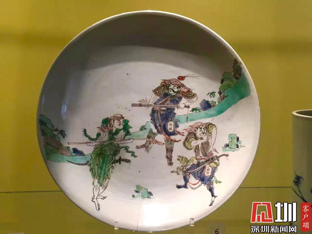 另一款水滸故事粉彩盤(pán)上,三個(gè)人物都有姓名,分別是:楊雄、解珍、阮小七。