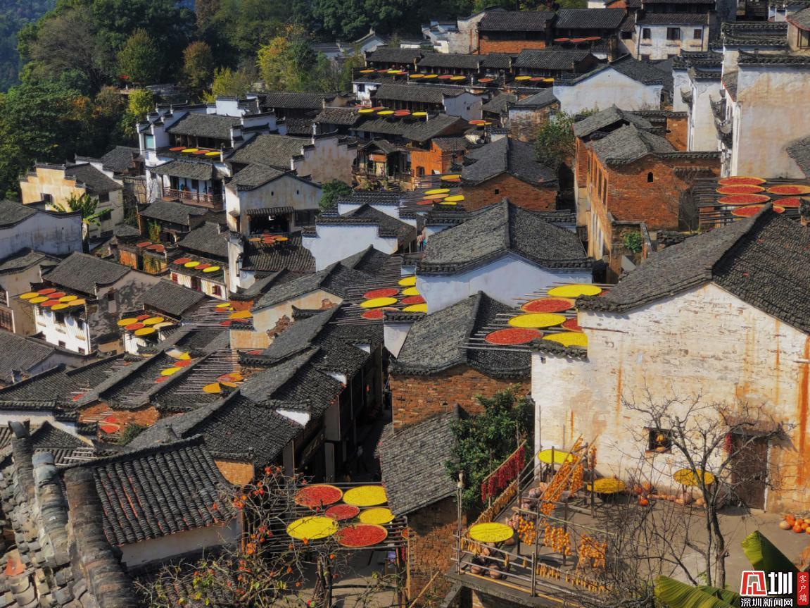 見圳客戶端·深圳新聞網(wǎng)2020年11月25日訊 江西婺源縣篁嶺村獨特的“曬秋”農(nóng)俗景觀。篁嶺村位于江西省上饒市婺源縣東北部,是著名的“曬秋”文化起源地,也是一座距今近六百年歷史的徽州古村。每當日出山頭,數(shù)百棟徽派古民居在百米落差的坡面錯落排布,整個山間村落徽式民居土磚外墻與曬架上五彩繽紛豐收成果組合,繪就出“曬秋”農(nóng)俗特色景觀。