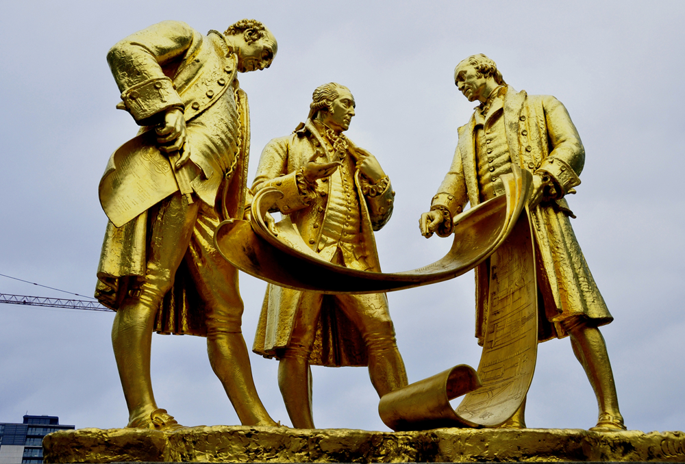 伯明翰是工業(yè)革命的發(fā)源地,市區(qū)會(huì)展中心對(duì)面有一座代表城市形象的雕塑作品,三個(gè)鎦金人物的塑像并肩佇立,正在討論問題,其金燦燦外表十分搶眼。這三個(gè)塑像是英國(guó)工業(yè)革命時(shí)期的杰出人物,蒸汽機(jī)的發(fā)明和制造者瓦特,蒸汽機(jī)和煤氣街燈的發(fā)明者默克多,工業(yè)家和機(jī)械制造商馬修·博爾頓。李仁奇 攝