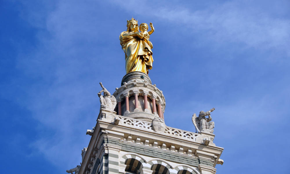 教堂主體建筑上方有一座金色的高達9.7米的鍍金圣母像,據說,幾乎在馬賽的任何角度都可看到這尊閃閃發(fā)光的圣母像,教堂也因此成為馬賽的標志。李仁奇 攝