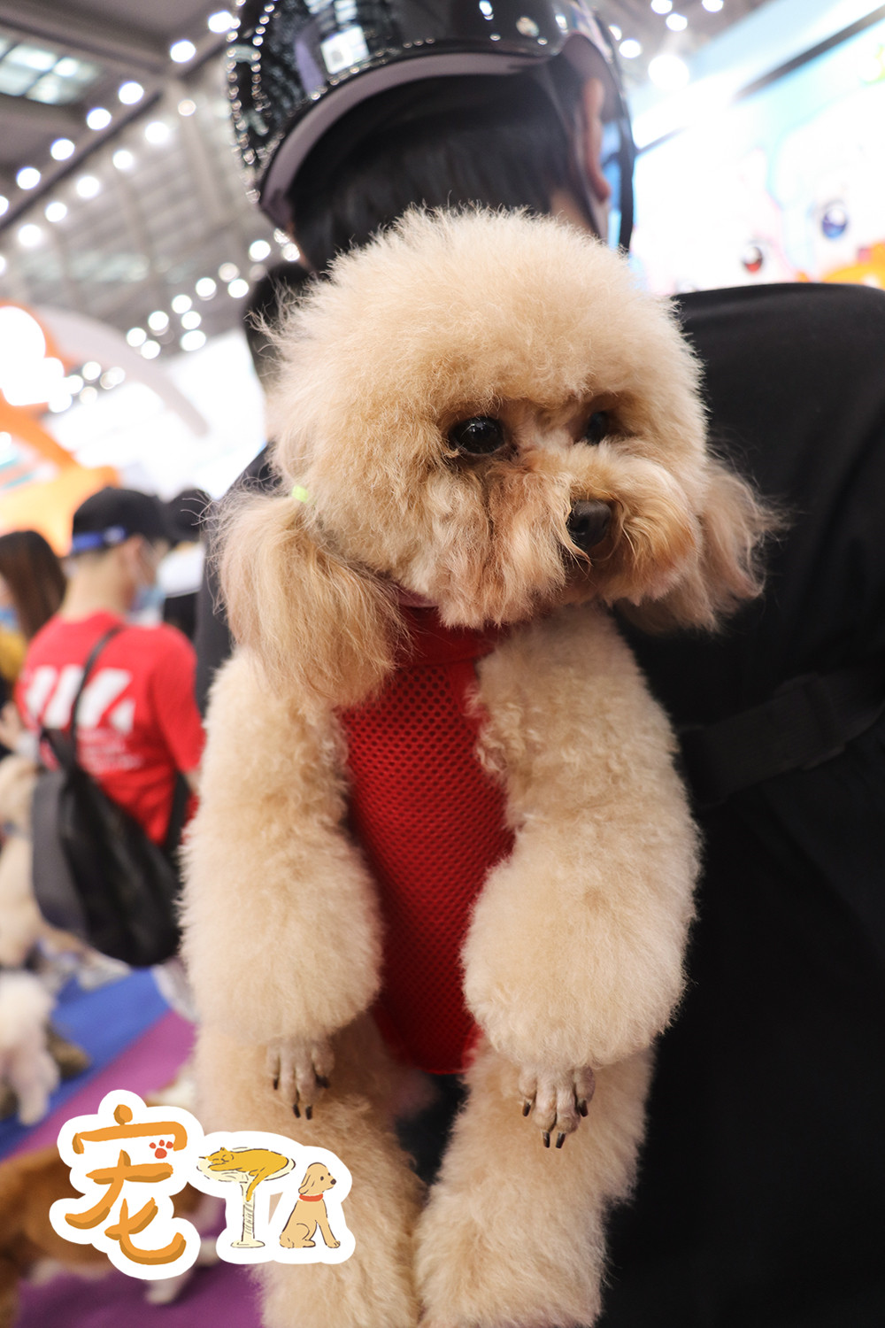有家長背著自家的寵物犬逛展。