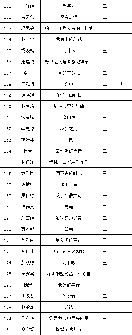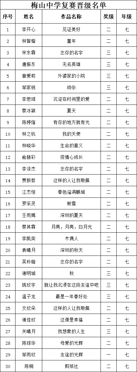 自2021年1月,活動征稿啟動以來,獲得了深圳市廣大中小學生、教師、文學愛好者的熱烈響應積極參與,吸引了深圳百余所學校的上萬人關注報名?,F(xiàn)公布福田區(qū)梅山中學晉級復賽名單如下: