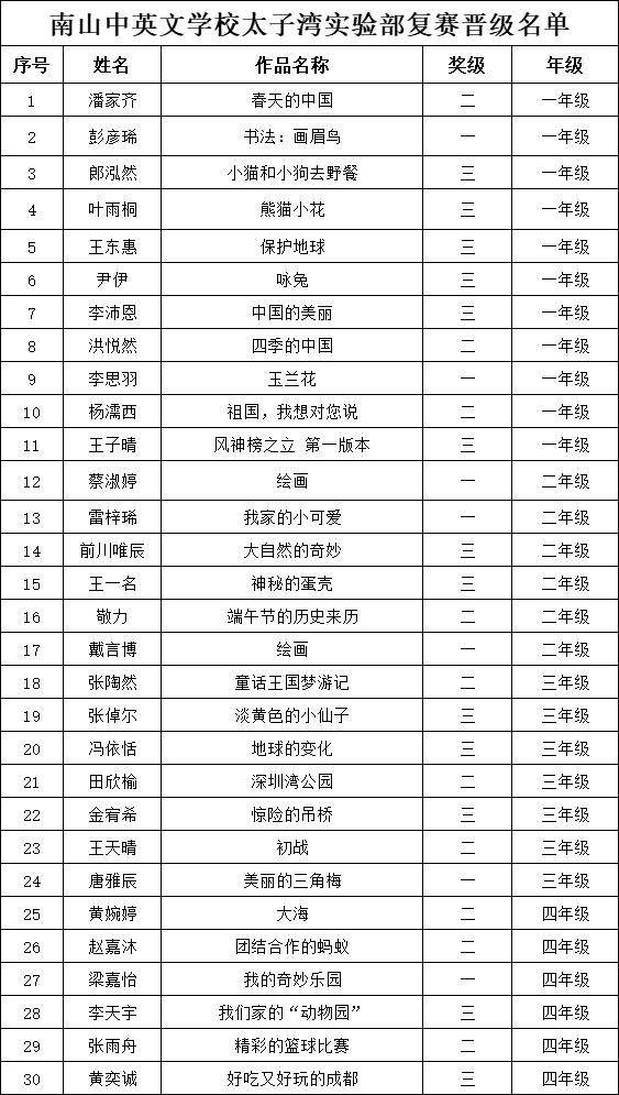 自2021年1月,活動征稿啟動以來,獲得了深圳市廣大中小學(xué)生、教師、文學(xué)愛好者的熱烈響應(yīng)積極參與,吸引了深圳百余所學(xué)校的上萬人關(guān)注報(bào)名。現(xiàn)公布南山中英文學(xué)校太子灣實(shí)驗(yàn)部晉級復(fù)賽名單如下: