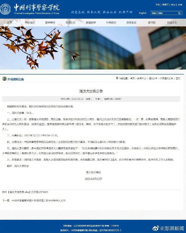 6月22日,中國刑警學(xué)院發(fā)布了一則淘汰犬出售公告。