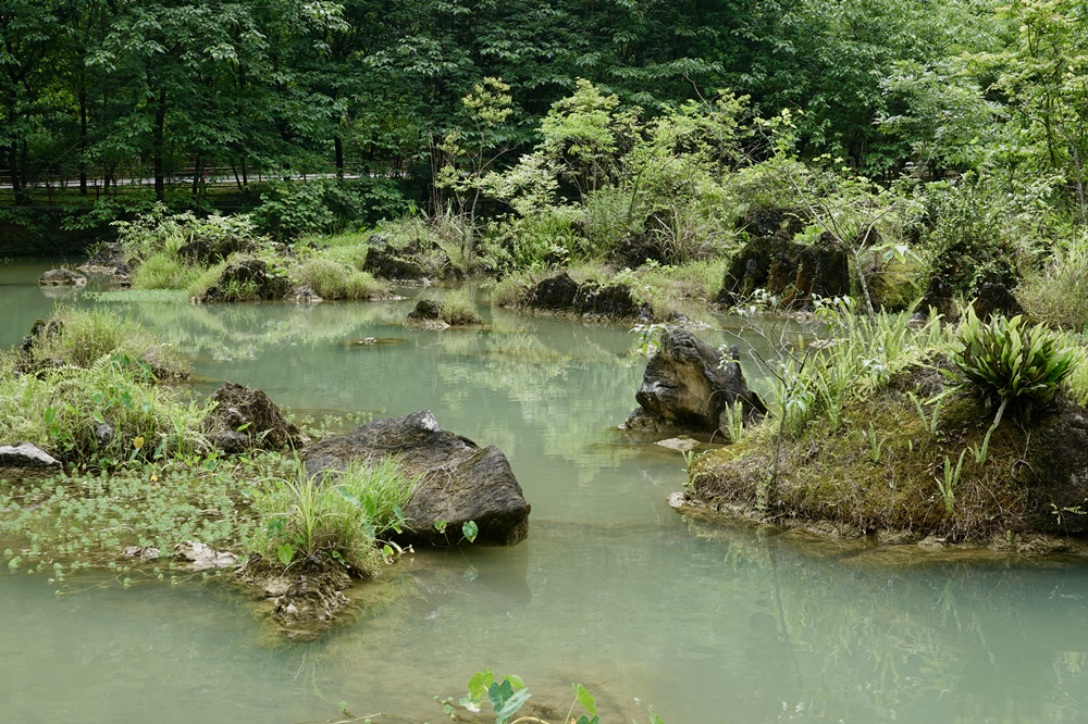 臥龍?zhí)哆吂质鏄淞至?,潭面如鏡子般平靜。李仁奇 攝
