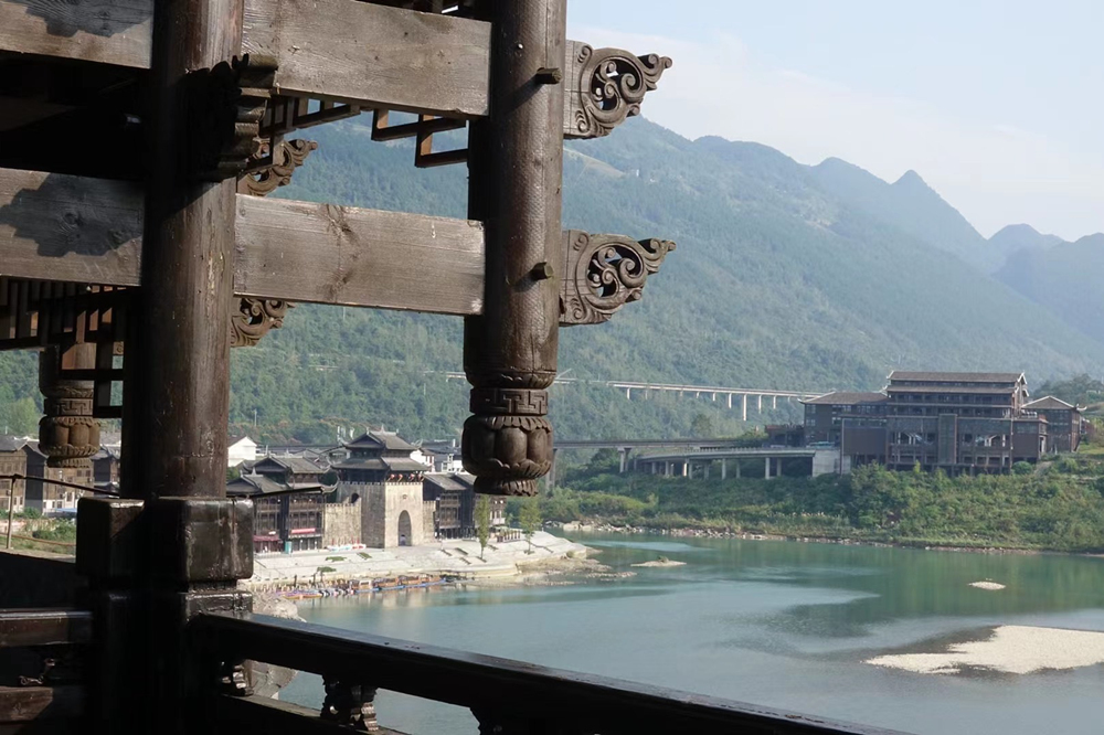 濯水廊橋長658米、寬5米,分為橋、塔、亭三部分,橋身為純木結構,建筑材料之間以榫頭卯眼互相穿插銜接,直套斜穿,牢固精密。李仁奇 攝