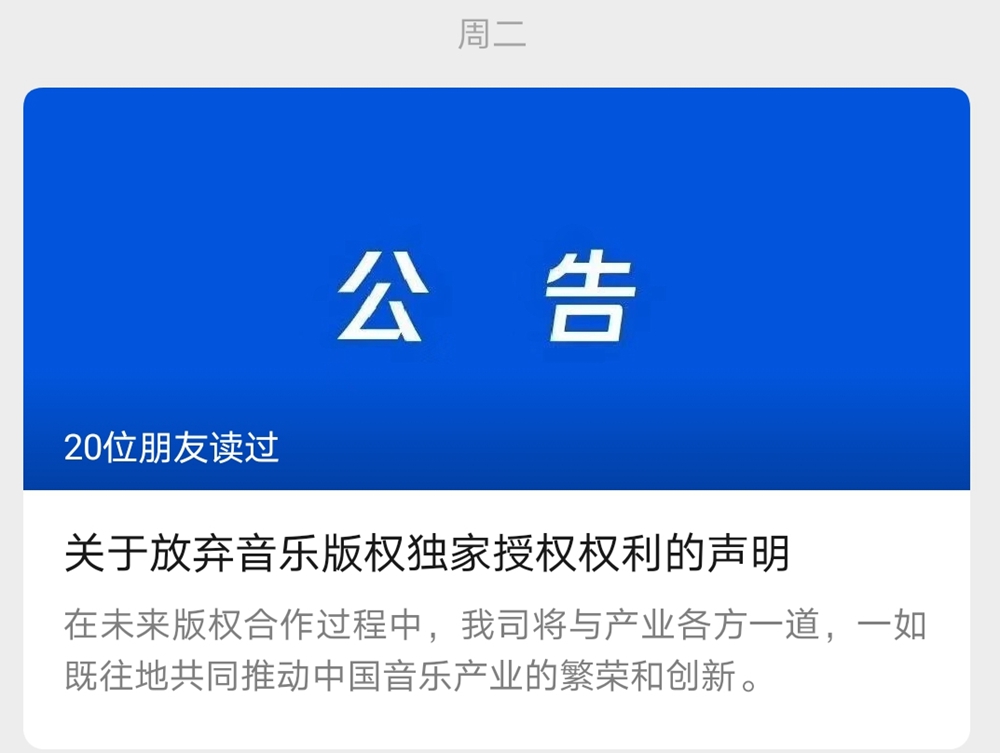 (相關(guān)報道:發(fā)聲明放棄音樂版權(quán)獨(dú)家授權(quán),騰訊為啥這樣做)