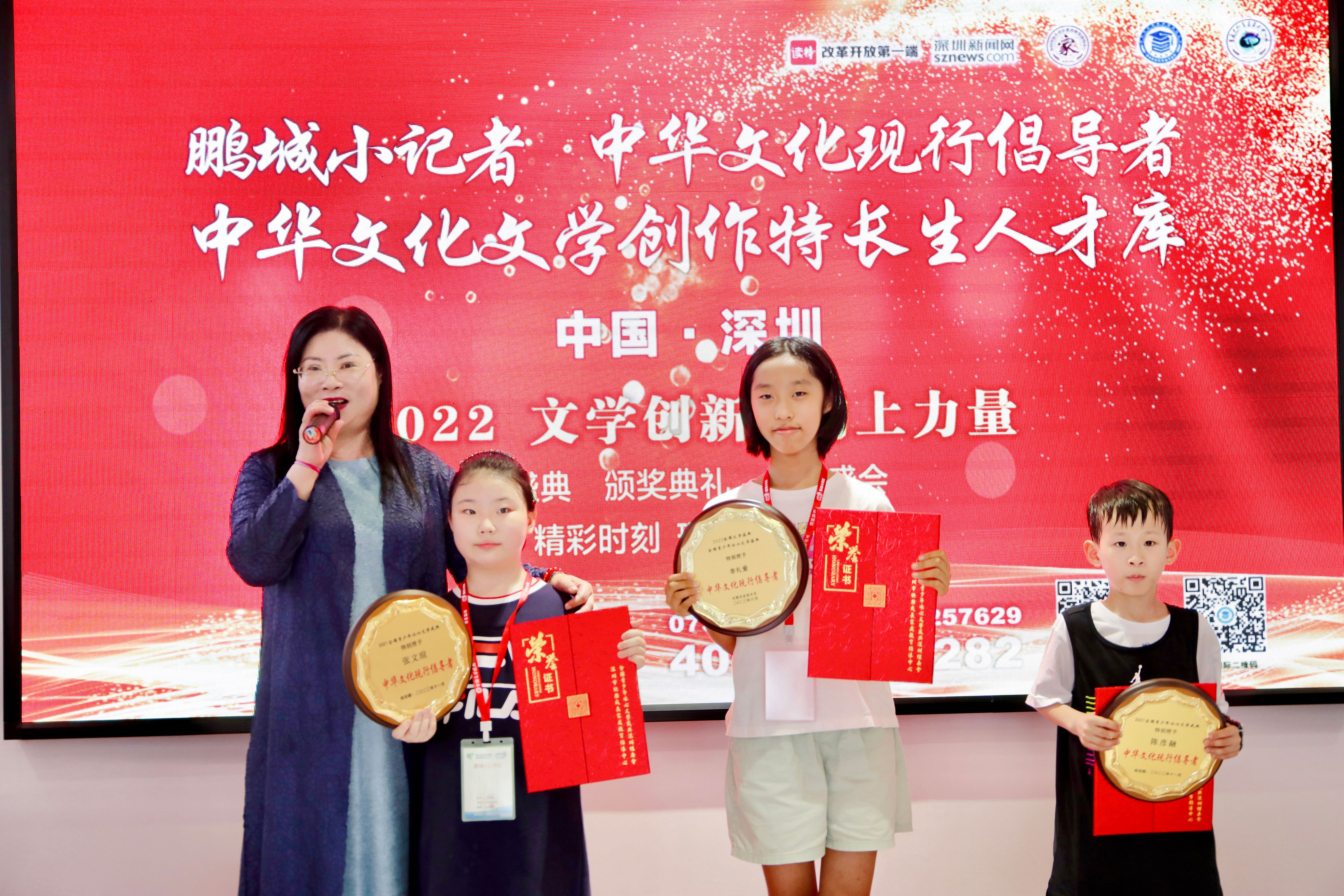 “中華文化現(xiàn)行倡導(dǎo)者”“中華文化文學(xué)特長(zhǎng)生人才庫(kù)”和“鵬城小記者”的優(yōu)生代表與頒獎(jiǎng)嘉賓合影留念