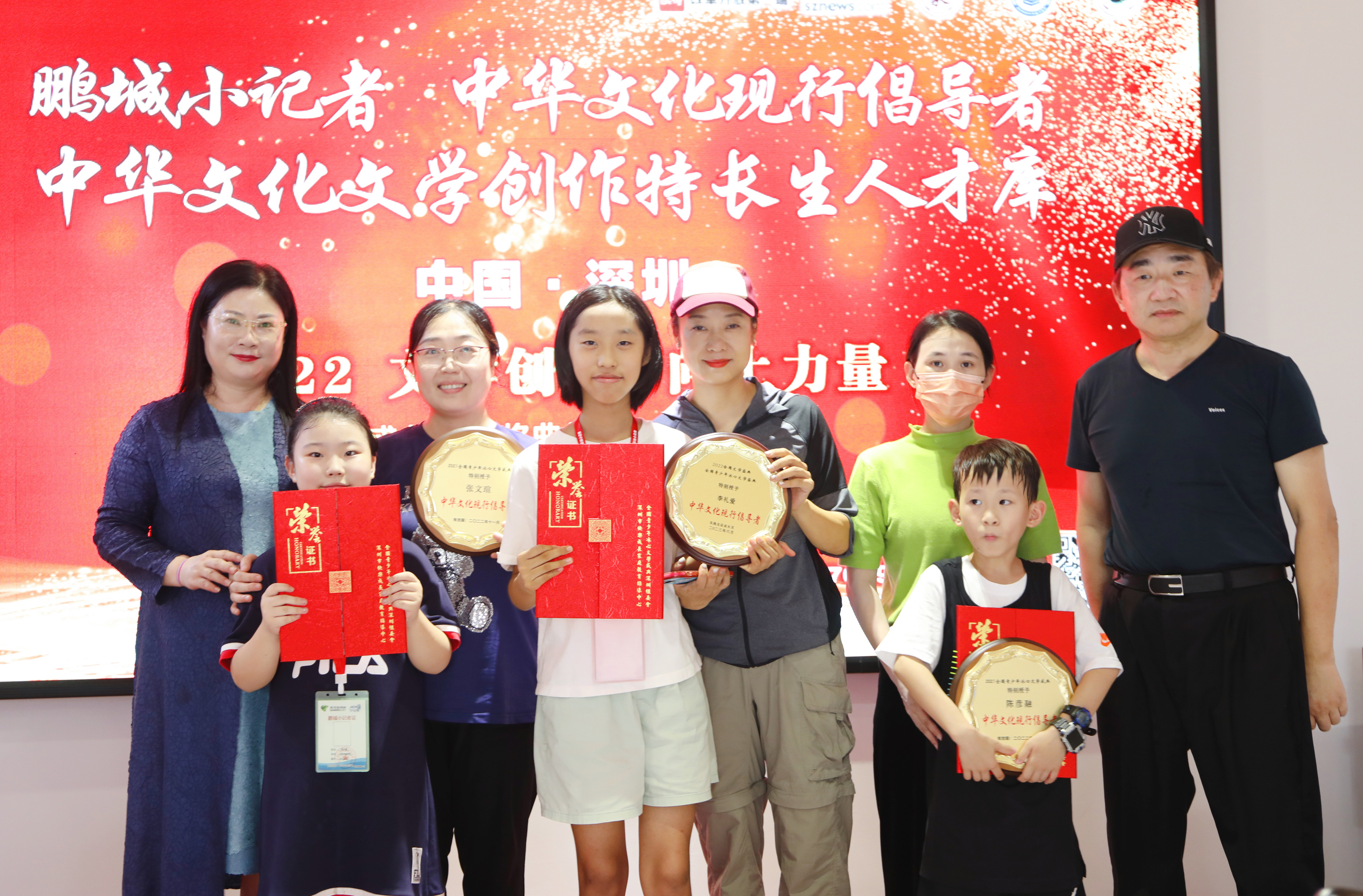 “中華文化現(xiàn)行倡導(dǎo)者”“中華文化文學(xué)特長生人才庫”和“鵬城小記者”的優(yōu)生代表們與家長、頒獎(jiǎng)嘉賓合影留念