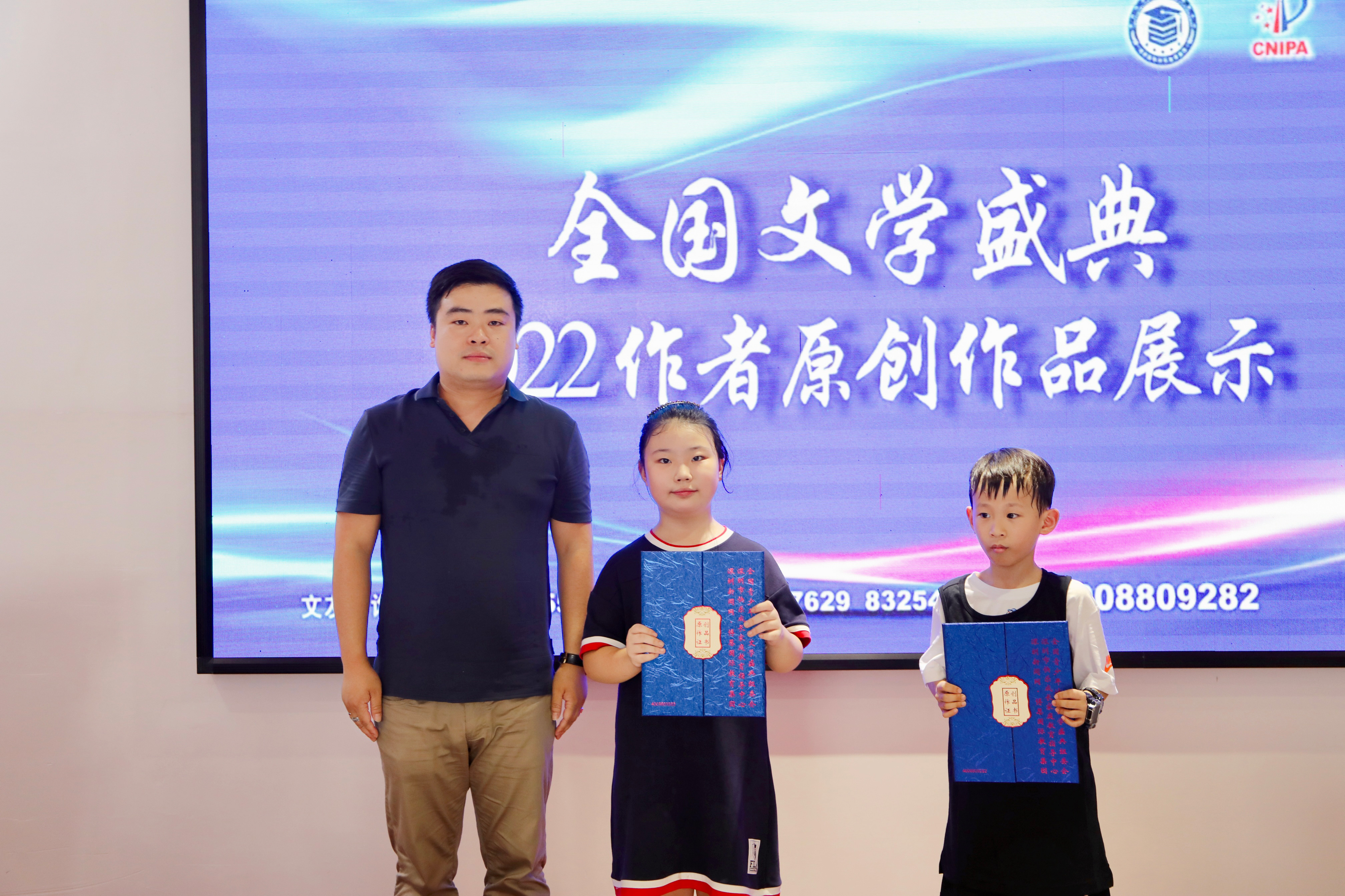 獲得原創(chuàng)作品證書和入選原創(chuàng)作品個(gè)人專輯的作者代表們與頒獎(jiǎng)嘉賓合影