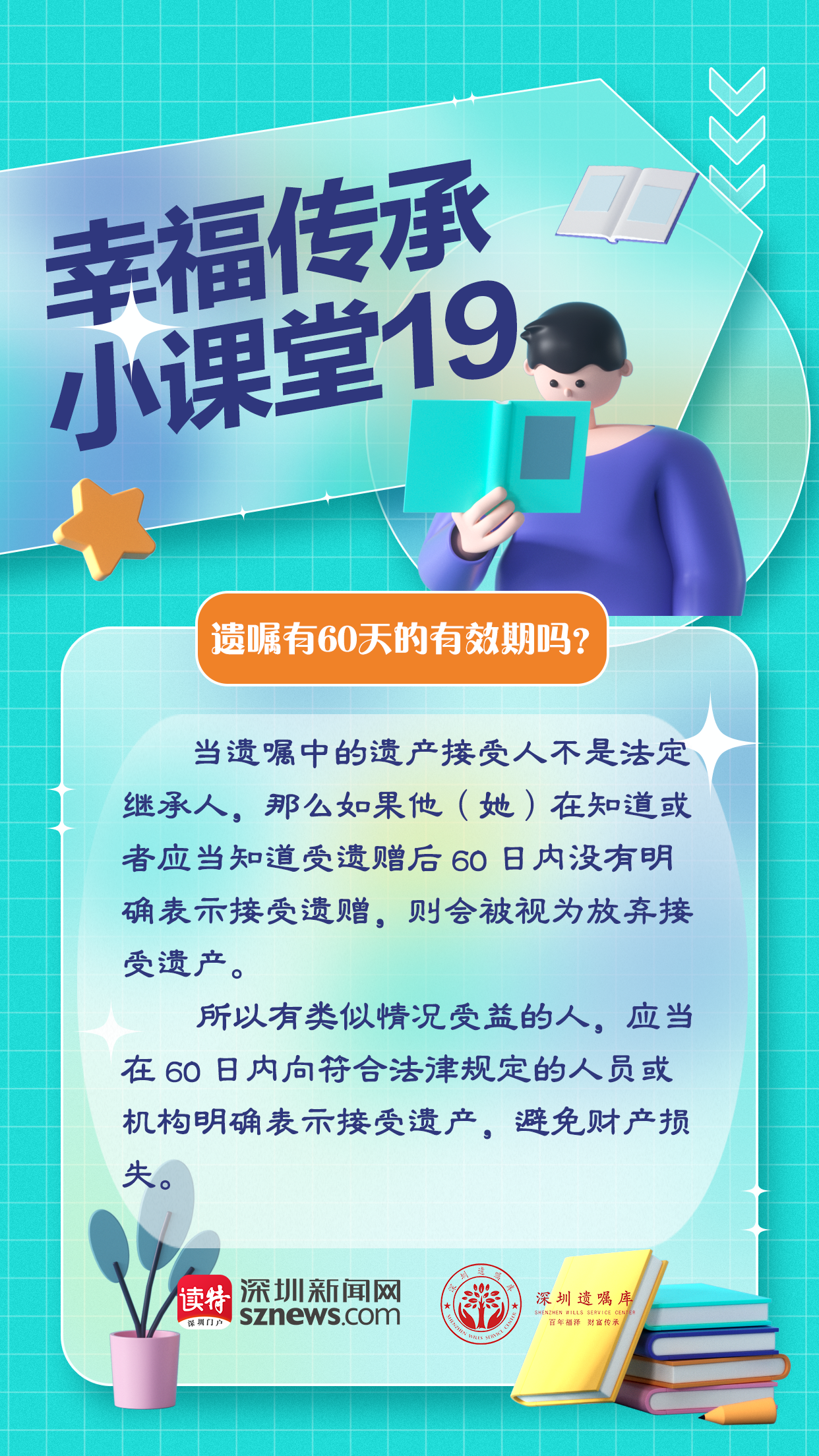 讀特客戶端·深圳新聞網(wǎng)2022年11月14日訊(記者 張玲 翁任瑩)遺囑是有有效期的,60天。當(dāng)遺囑中的遺產(chǎn)接受人不是法定繼承人,那么在他(她)知道或者應(yīng)當(dāng)知道受遺贈(zèng)后60日內(nèi)沒有明確表示接受遺贈(zèng),則會(huì)被視為放棄接受遺產(chǎn)。