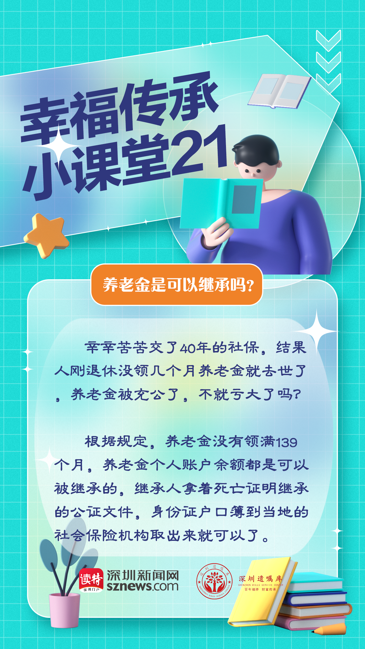 深圳遺囑庫與深圳新聞網(wǎng)聯(lián)合制作的幸福傳承小課堂第21期,我們來聊聊養(yǎng)老金繼承問題。根據(jù)規(guī)定,養(yǎng)老金沒有領(lǐng)滿139個(gè)月,養(yǎng)老金個(gè)人賬戶余額都是可以被繼承的。繼承人拿著死亡證明繼承的公證文件,身份證戶口簿到當(dāng)?shù)氐纳鐣?huì)保險(xiǎn)機(jī)構(gòu)取出來就可以了。
