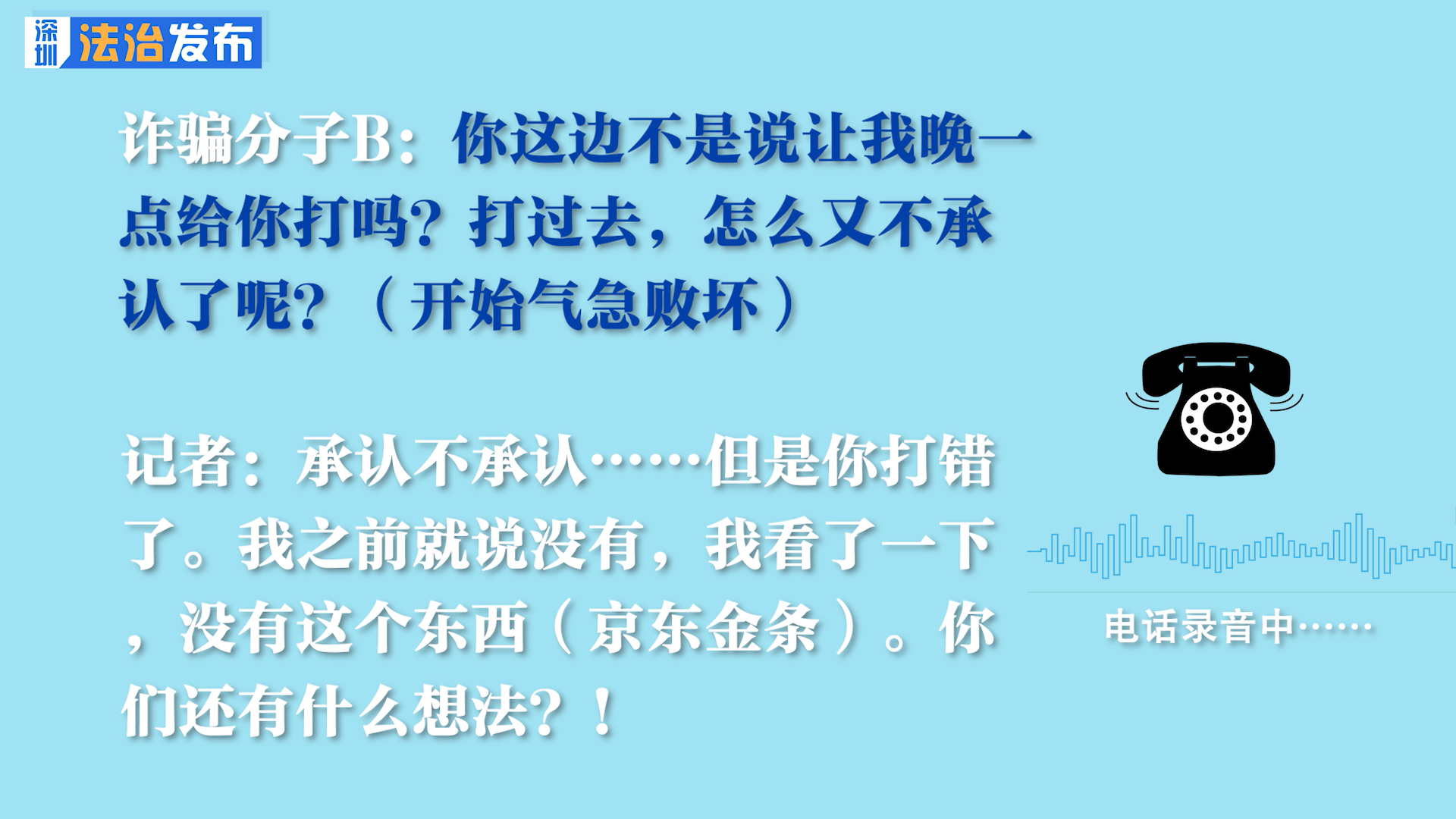 詐騙分子B:你這邊不是說讓我晚一點給你打嗎?打過去,怎么又不承認了呢?(開始氣急敗壞)