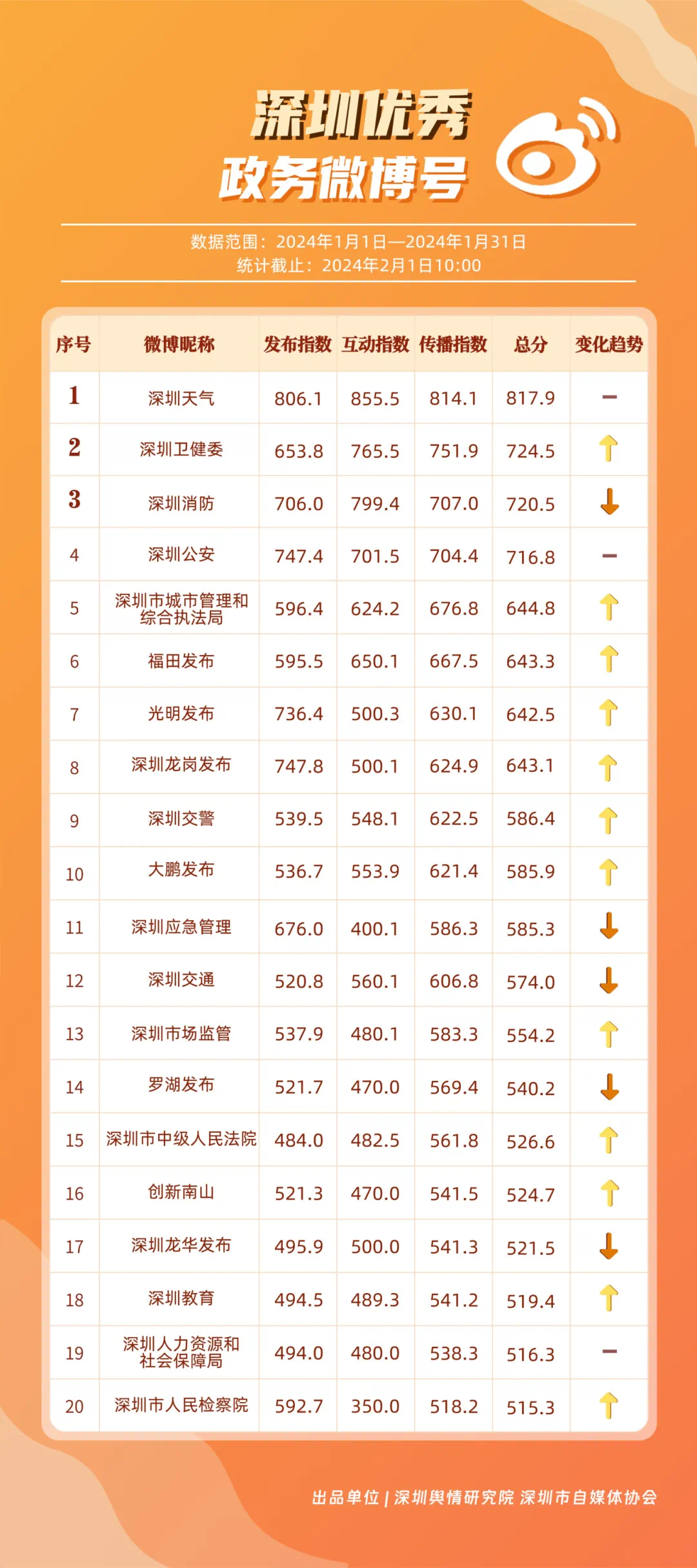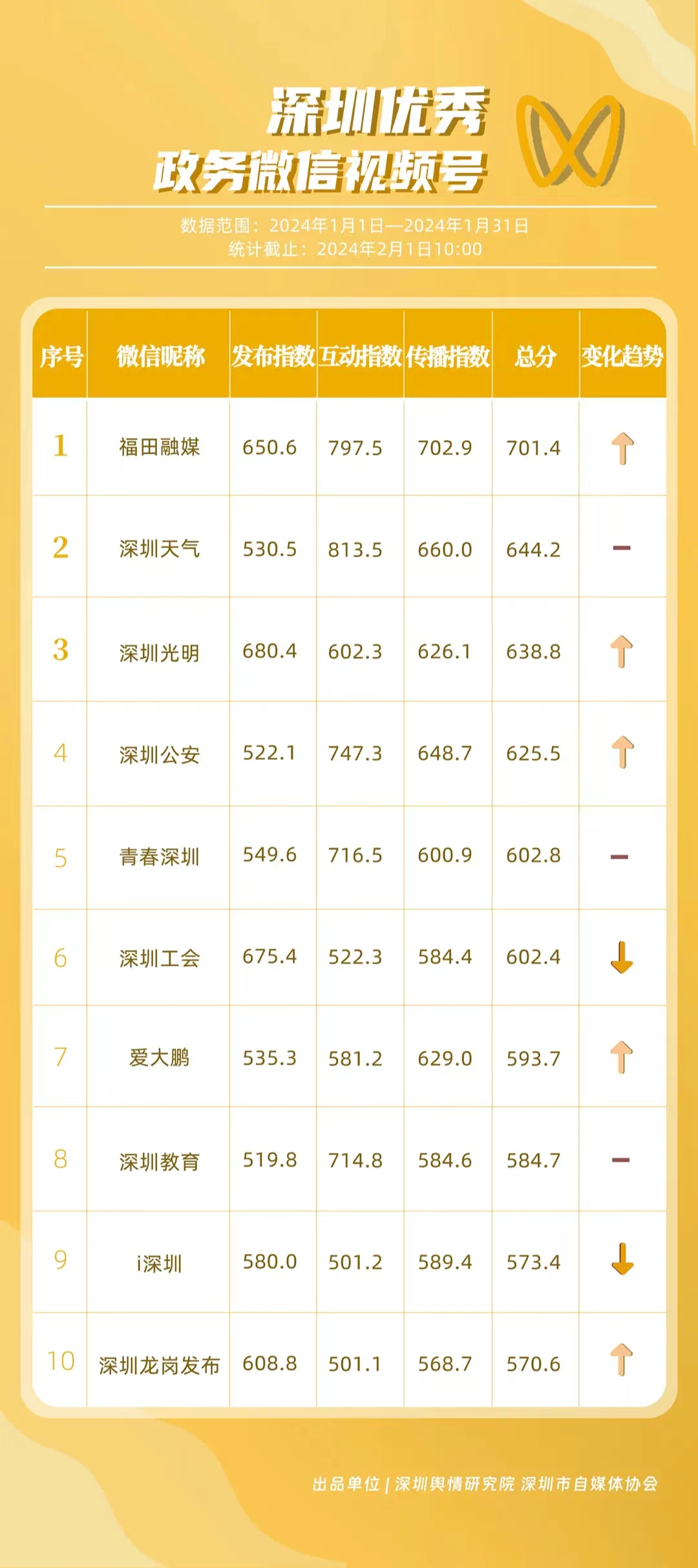 深圳新聞網(wǎng)2月9日訊(記者 陳曉君 實習(xí)生 張馳)2月8日,深圳輿情研究院、深圳市自媒體協(xié)會聯(lián)合推出《深圳優(yōu)秀政務(wù)新媒體矩陣》(2024年1月期),市衛(wèi)生健康委、市氣象局、福田區(qū)、光明區(qū)、龍崗區(qū)、龍華區(qū)、市公安局、市應(yīng)急管理局、市交通警察局、羅湖區(qū)的新媒體矩陣獲評“深圳優(yōu)秀政務(wù)新媒體矩陣”。這些矩陣在內(nèi)容發(fā)布、受眾互動和信息傳播方面取得了較好成績,并在深圳政務(wù)新媒體規(guī)范有序發(fā)展進程中發(fā)揮著積極作用。