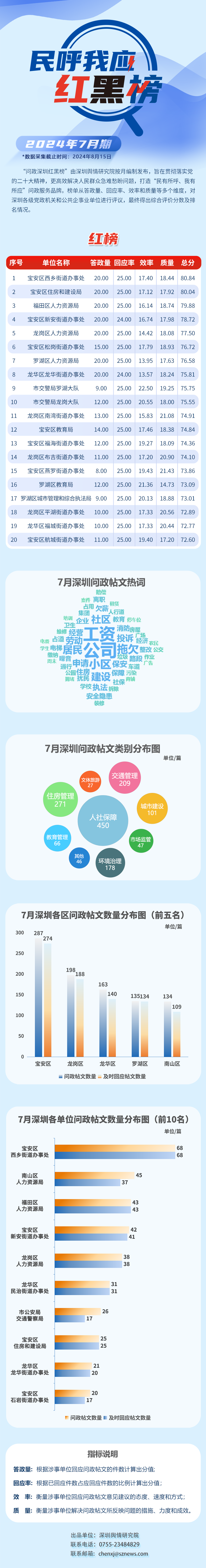 本期榜單采集的帖文主要來自深圳市及各區(qū)政府官網(wǎng)、深圳論壇、人民網(wǎng)領(lǐng)導(dǎo)留言板、深圳新聞網(wǎng)“民呼我應(yīng)”等平臺(tái),所采集帖文發(fā)布時(shí)間為2024年7月1日至7月31日,采集截止時(shí)間為2024年8月15日。