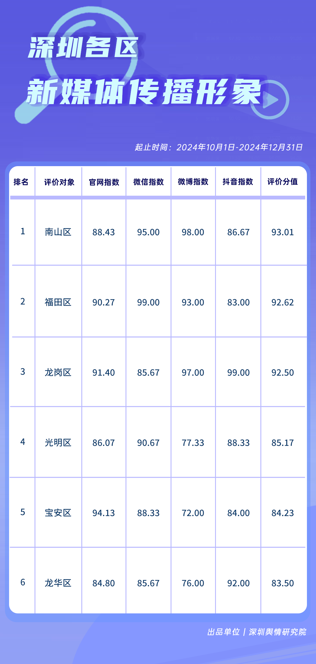各區(qū)各單位在網(wǎng)絡(luò)形象建設(shè)領(lǐng)域取得了哪些成績?《深圳各區(qū)各單位網(wǎng)絡(luò)形象建設(shè)榜》(10-12月期)為您詳細(xì)揭曉,本期榜單數(shù)據(jù)統(tǒng)計(jì)時間范圍為2024年10月1日至12月31日。