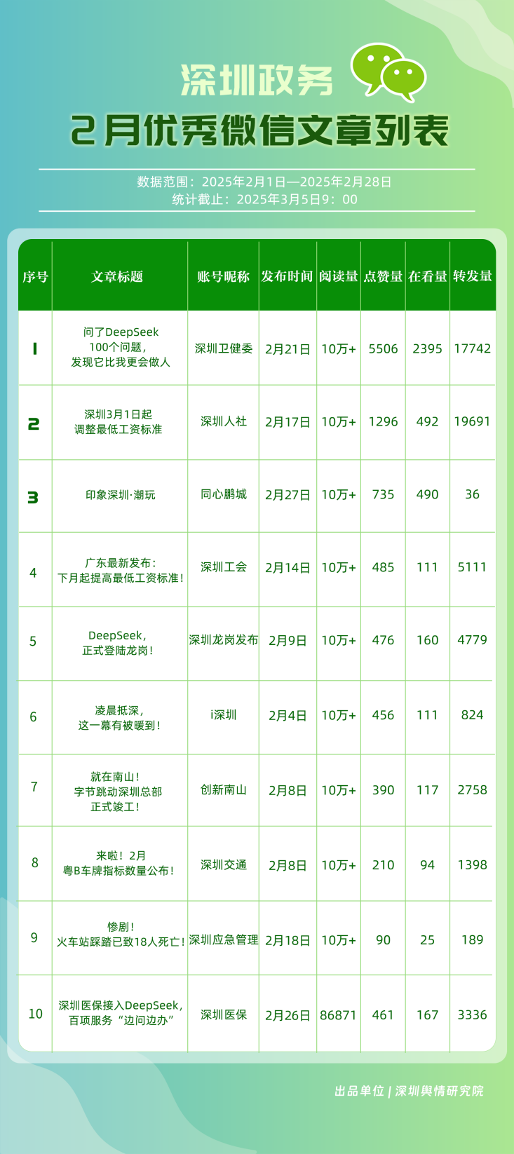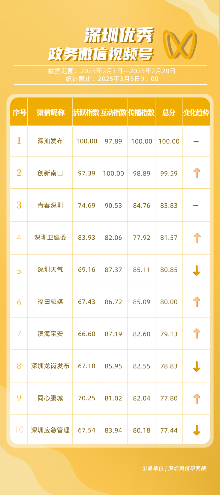 2025年2月期《深圳優(yōu)秀政務(wù)新媒體矩陣》發(fā)布,本期榜單框架有所優(yōu)化,公眾號、微博號、抖音號、視頻號得分在綜合計(jì)算時(shí)的權(quán)重調(diào)整為30%、20%、30%、20%。公眾號榜單中,根據(jù)閱讀量超10萬次的文章篇數(shù),在傳播指數(shù)額外加分,激勵優(yōu)質(zhì)內(nèi)容產(chǎn)出。接下來,讓我們一同揭曉,2月哪些矩陣成為政務(wù)信息傳播與服務(wù)創(chuàng)新標(biāo)桿,為政務(wù)新媒體矩陣創(chuàng)新發(fā)展樹立高質(zhì)量發(fā)展范式。