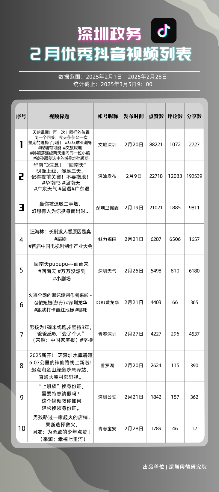 2月,“深汕發(fā)布”“深圳天氣”“魅力福田”“深圳衛(wèi)健委”“文旅深圳”“掌上龍崗”“青春深圳”“DOU愛龍華”“深圳工會”“深圳公安”共10個(gè)政務(wù)抖音號獲得“深圳優(yōu)秀政務(wù)抖音號”稱號?!吧钌前l(fā)布”位于榜單第一名,值得關(guān)注的是,該賬號2月作品總分享數(shù)超20萬次,其中有關(guān)“華南地區(qū)回南天”的視頻單條分享量達(dá)到19萬次以上,展現(xiàn)出強(qiáng)勁的傳播力?!吧钲谔鞖狻薄镑攘ΩL铩薄吧钲谛l(wèi)健委”三賬號堅(jiān)持輸出優(yōu)質(zhì)內(nèi)容,得分均在94分以上,展現(xiàn)出深圳政務(wù)新媒體賬號在短視頻傳播領(lǐng)域的創(chuàng)新活力。