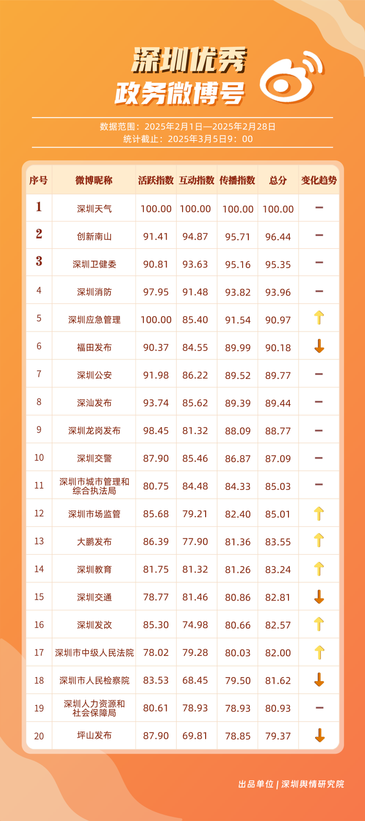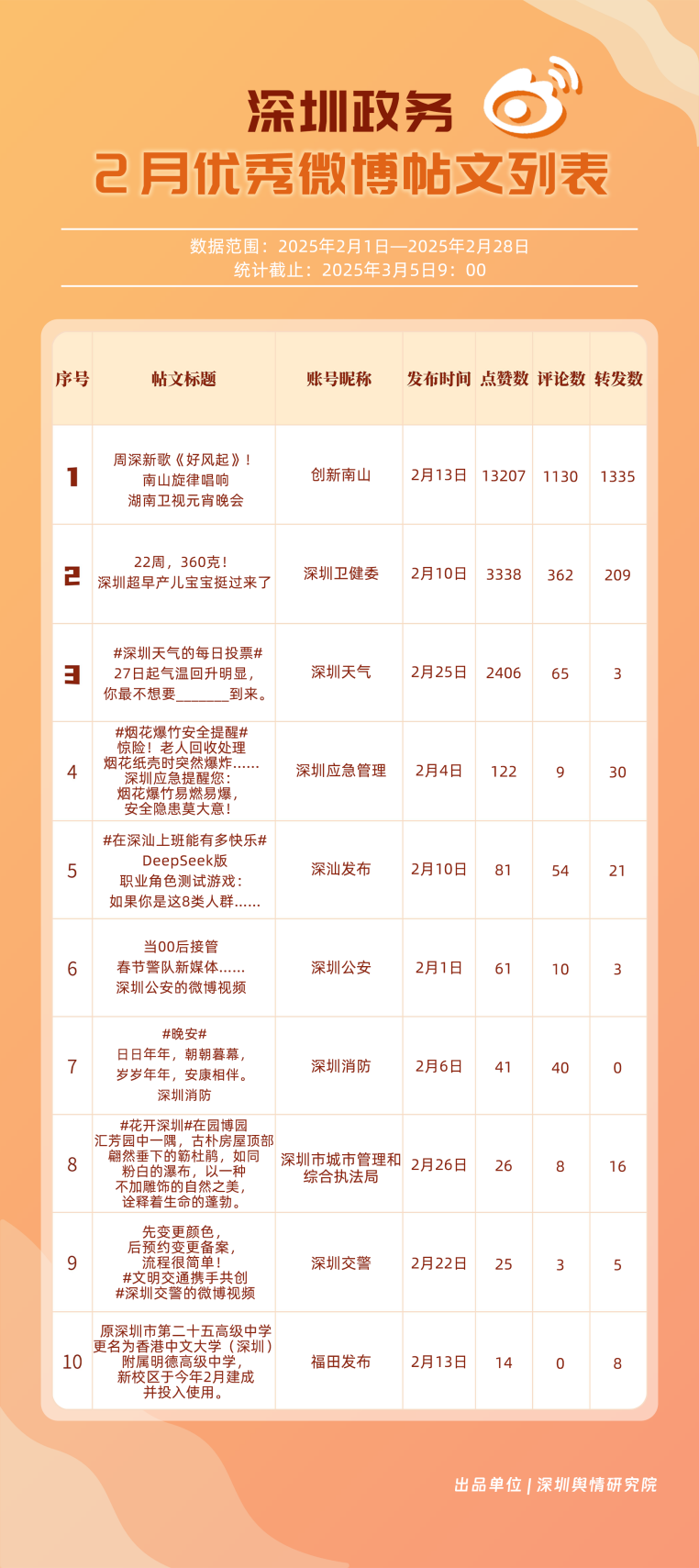 2月,“深圳天氣”“創(chuàng)新南山”“深圳衛(wèi)健委”“深圳消防”“深圳應(yīng)急管理”“福田發(fā)布”“深圳公安”“深汕發(fā)布”“深圳龍崗發(fā)布”“深圳交警”等20個(gè)賬號入選“優(yōu)秀政務(wù)微博號”。綜合看來,本月榜單前10名較上期變動不大,反映出靠前賬號運(yùn)營發(fā)揮較穩(wěn)定。其中,“深圳天氣”在榜單中獲得第一名,該賬號與網(wǎng)民互動積極,2月作品總點(diǎn)贊數(shù)超8萬次;“創(chuàng)新南山”“深圳衛(wèi)健委”“深圳消防”“深圳應(yīng)急管理”也各有所長,排名靠前,展現(xiàn)出深圳政務(wù)微博在形象塑造、民生服務(wù)、應(yīng)急科普等領(lǐng)域的持續(xù)影響力。