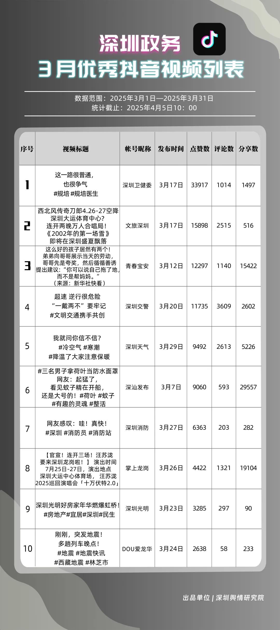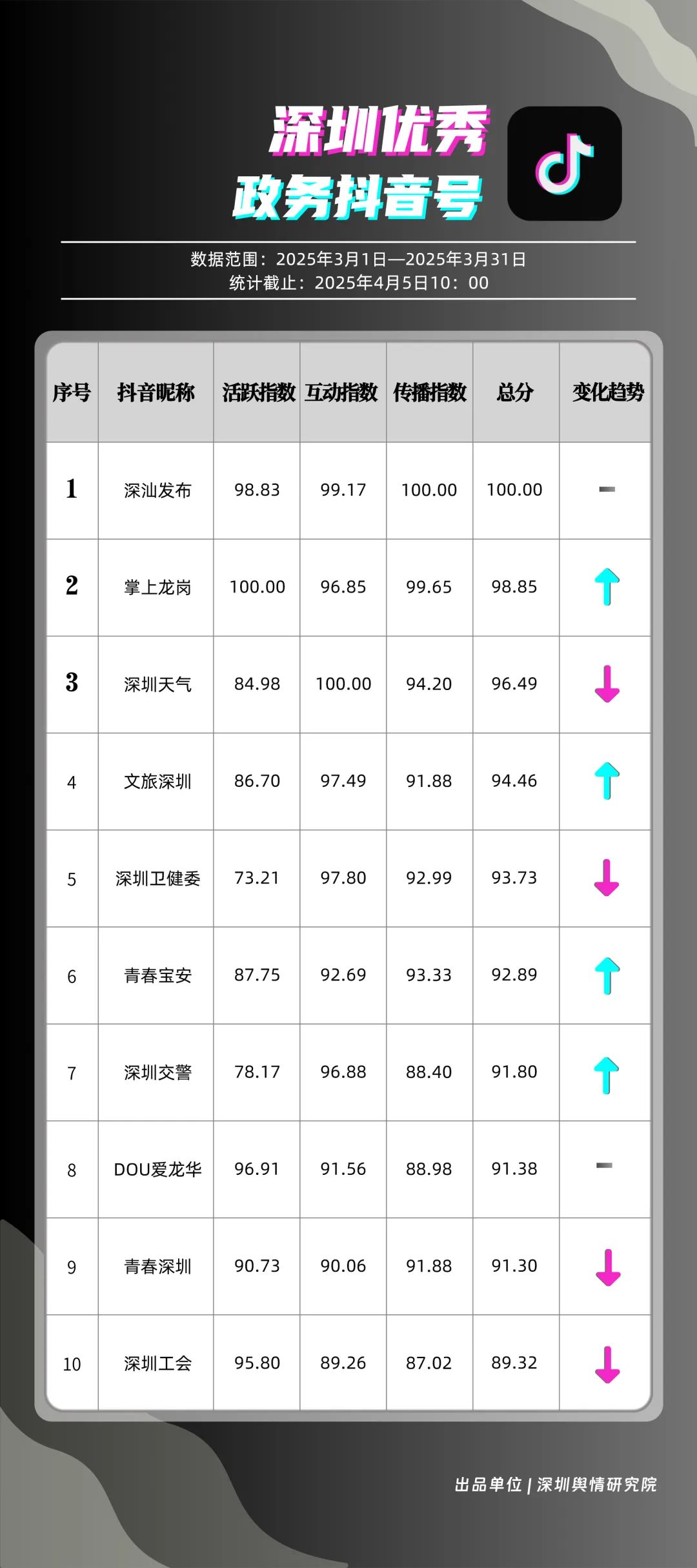 3月,“深汕發(fā)布”“掌上龍崗”“深圳天氣”“文旅深圳”“深圳衛(wèi)健委”“青春寶安”“深圳交警”“DOU愛龍華”“青春深圳”“深圳工會(huì)”共10個(gè)政務(wù)抖音號(hào)獲得“深圳優(yōu)秀政務(wù)抖音號(hào)”稱號(hào)。其中,“深汕發(fā)布”位于榜單第一名,3月共收獲5萬余次點(diǎn)贊、8萬余次轉(zhuǎn)發(fā),反映出賬號(hào)作品的較高吸引力;“深圳龍崗”以98.85分位于榜單第二名,與榜首分差微小,整體實(shí)力不俗。緊隨其后的分別是“深圳天氣”“文旅深圳”“深圳衛(wèi)健委”,三賬號(hào)產(chǎn)出內(nèi)容優(yōu)質(zhì),也獲得較高評(píng)分。相關(guān)上榜單位展現(xiàn)了深圳政務(wù)新媒體賬號(hào)在短視頻傳播領(lǐng)域的創(chuàng)新探索力與傳播實(shí)效性。