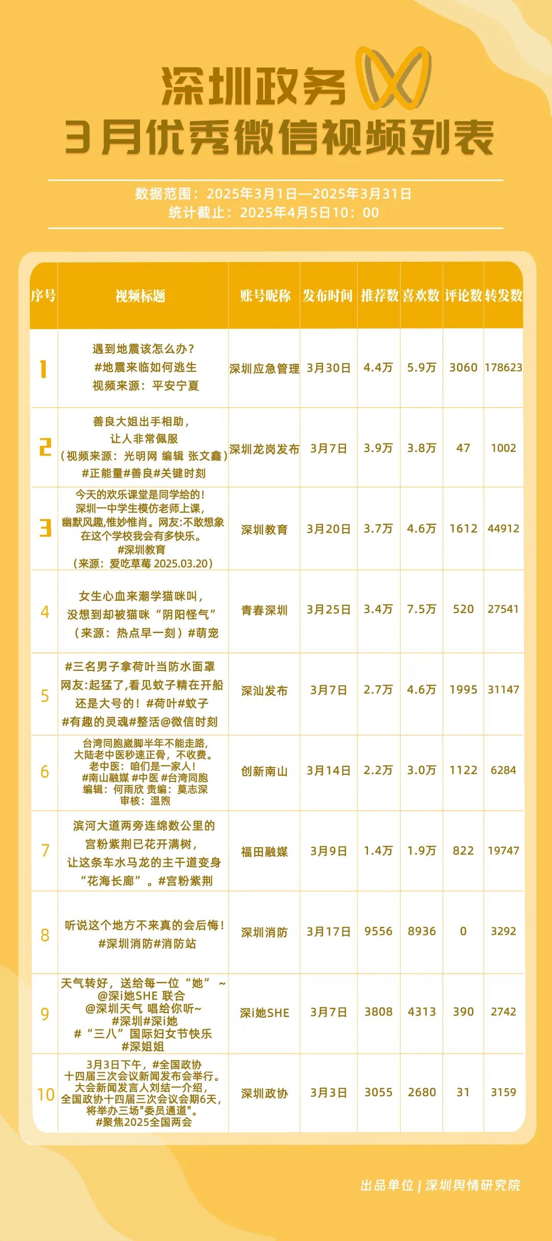 3月,獲“深圳優(yōu)秀政務(wù)微信視頻號(hào)”稱號(hào)的分別是“深圳應(yīng)急管理”“深圳教育”“深汕發(fā)布”“青春深圳”“創(chuàng)新南山”“福田融媒”“深圳龍崗發(fā)布”“深圳光明”“文旅深圳”“深圳天氣”。其中,“深圳應(yīng)急管理”以20余篇作品收獲超20萬次轉(zhuǎn)發(fā),躍居第一名,一期有關(guān)“地震來臨如何逃生”的視頻收獲超17萬次轉(zhuǎn)發(fā),展現(xiàn)了其內(nèi)容的高實(shí)用性?!吧钲诮逃薄吧钌前l(fā)布”位于榜單第二、三位,總分超90分,反映出兩賬號(hào)在民生教育、區(qū)域宣傳領(lǐng)域擁有較好傳播效果。“青春深圳”“創(chuàng)新南山”“福田融媒”等賬號(hào)也在3月發(fā)布優(yōu)質(zhì)視頻內(nèi)容,展現(xiàn)了深圳政務(wù)新媒體在視頻號(hào)平臺(tái)宣傳的創(chuàng)新探索。