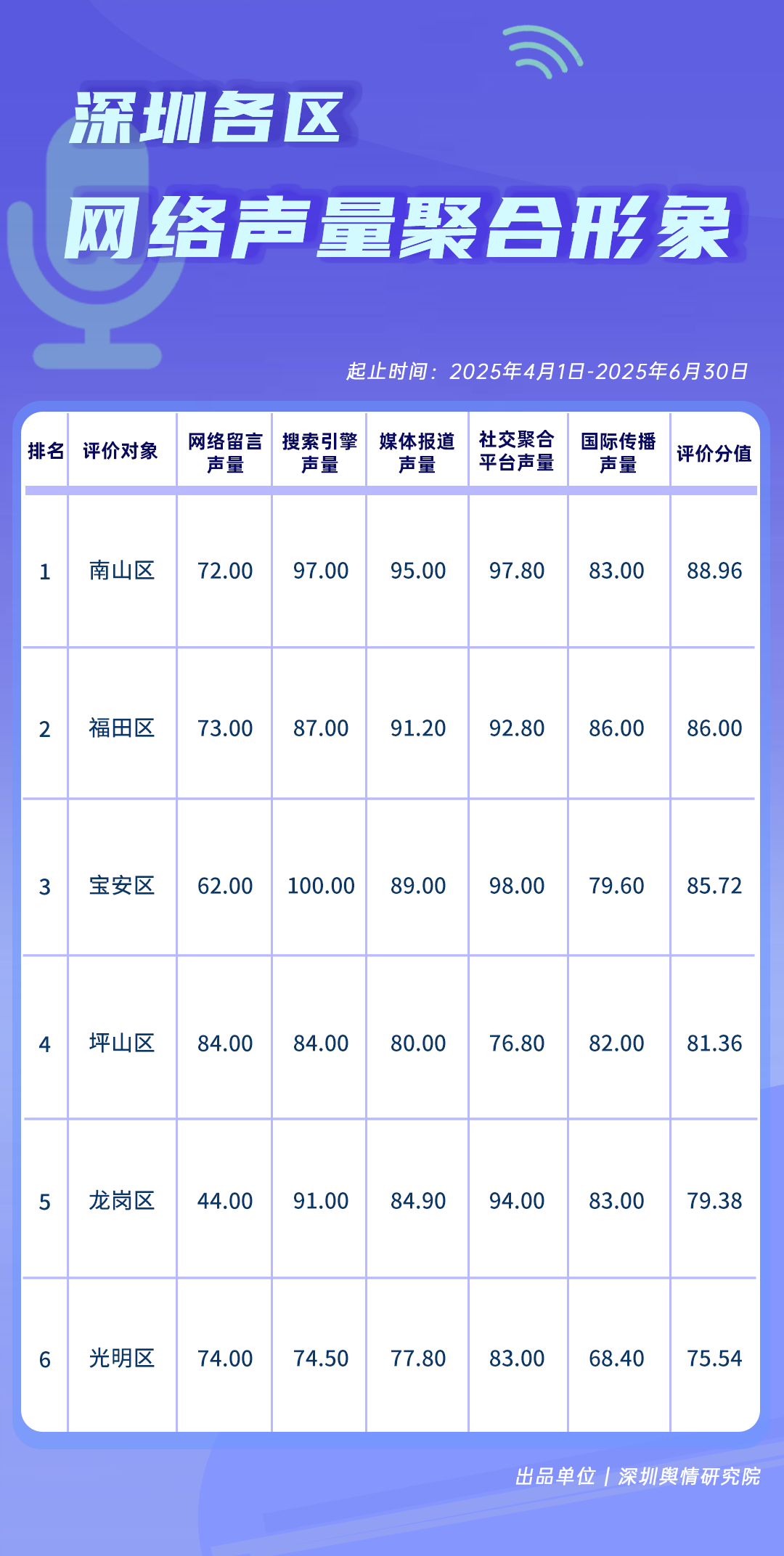 4-6月,《深圳各區(qū)網(wǎng)絡(luò)聲量聚合形象榜》中,南山區(qū)憑借各項聲量指標(biāo)的優(yōu)異表現(xiàn),以88.96分榮登榜首,福田區(qū)、寶安區(qū)緊隨其后,在搜索引擎聲量、媒體報道聲量等指標(biāo)上均斬獲高分,反映出市民及媒體對區(qū)域給予較高關(guān)注。坪山區(qū)、龍崗區(qū)、光明區(qū)也位居前列,表現(xiàn)不俗,為提升城市數(shù)字治理能級注入了源源不斷的動力。