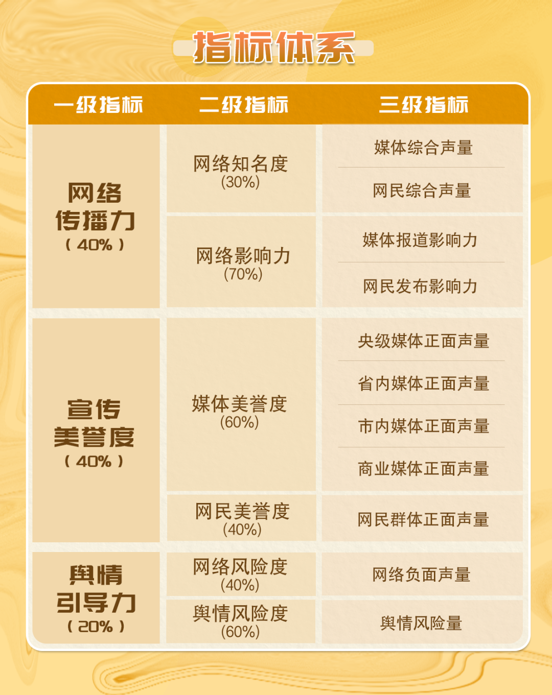 《深圳各街道網(wǎng)絡形象及影響力榜》具有科學、可信、量化的指標評價體系,能夠全面客觀地評估各街道的網(wǎng)絡綜合形象及影響力值。具體指標體系如下圖所示↓