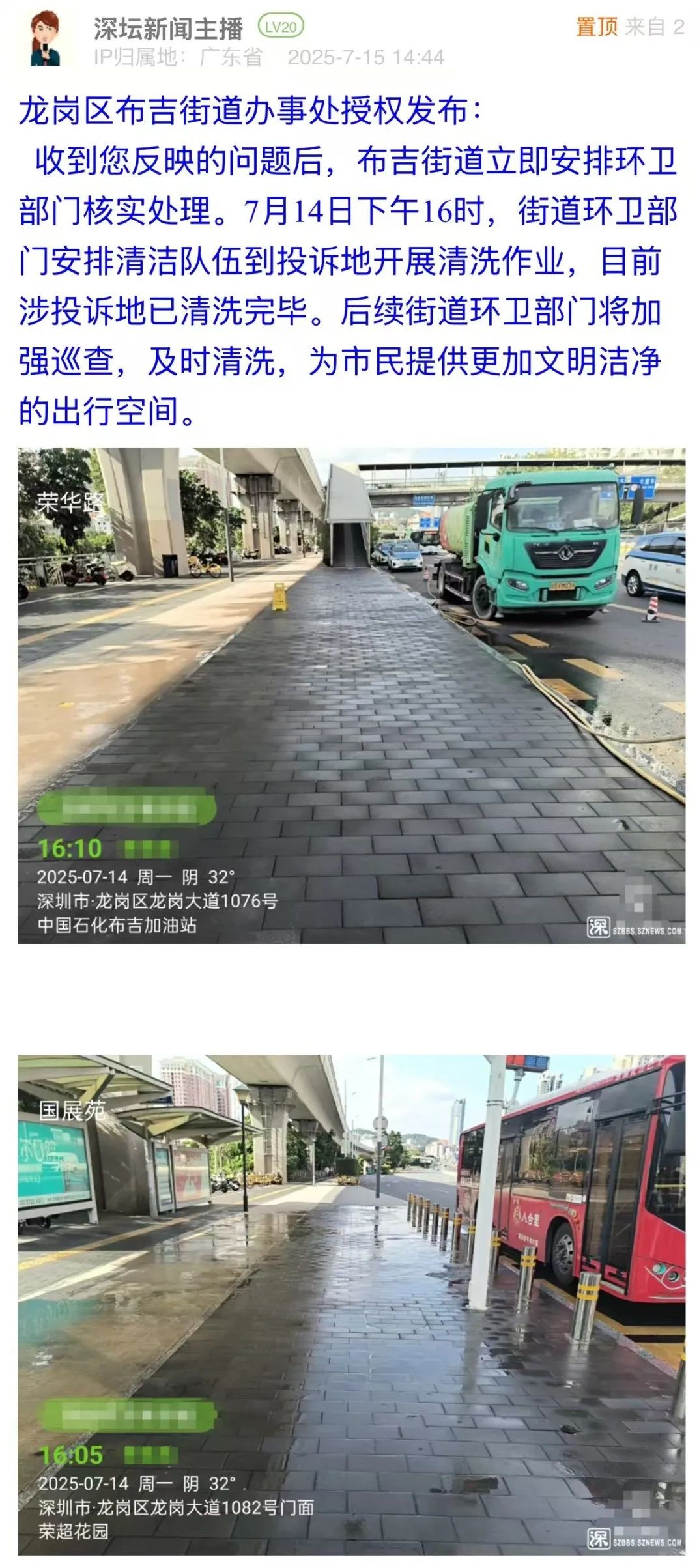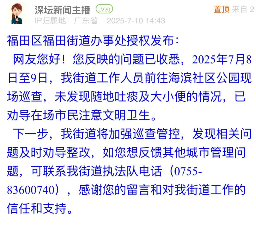 案例點(diǎn)評(píng):對(duì)于市民反映的路面油污問題,布吉街道辦立即安排環(huán)衛(wèi)部門進(jìn)行清洗,并于第二日在問政帖文下進(jìn)行回復(fù),以現(xiàn)場(chǎng)圖片展示路面清理效果,表示將加強(qiáng)后續(xù)巡查。此次處置展現(xiàn)了基層部門高效務(wù)實(shí)的問題處理能力,為城市道路環(huán)境管理提供了快速響應(yīng)與長(zhǎng)效維護(hù)相結(jié)合的實(shí)踐范例,切實(shí)回應(yīng)了市民對(duì)潔凈環(huán)境的期待。