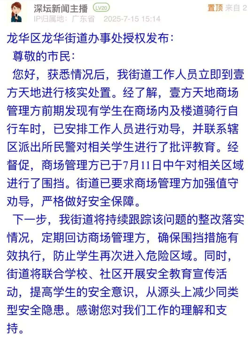 2、有市民反映龍華區(qū)壹方天地內(nèi)有學(xué)生危險(xiǎn)騎行,質(zhì)疑商場(chǎng)安全監(jiān)管不足